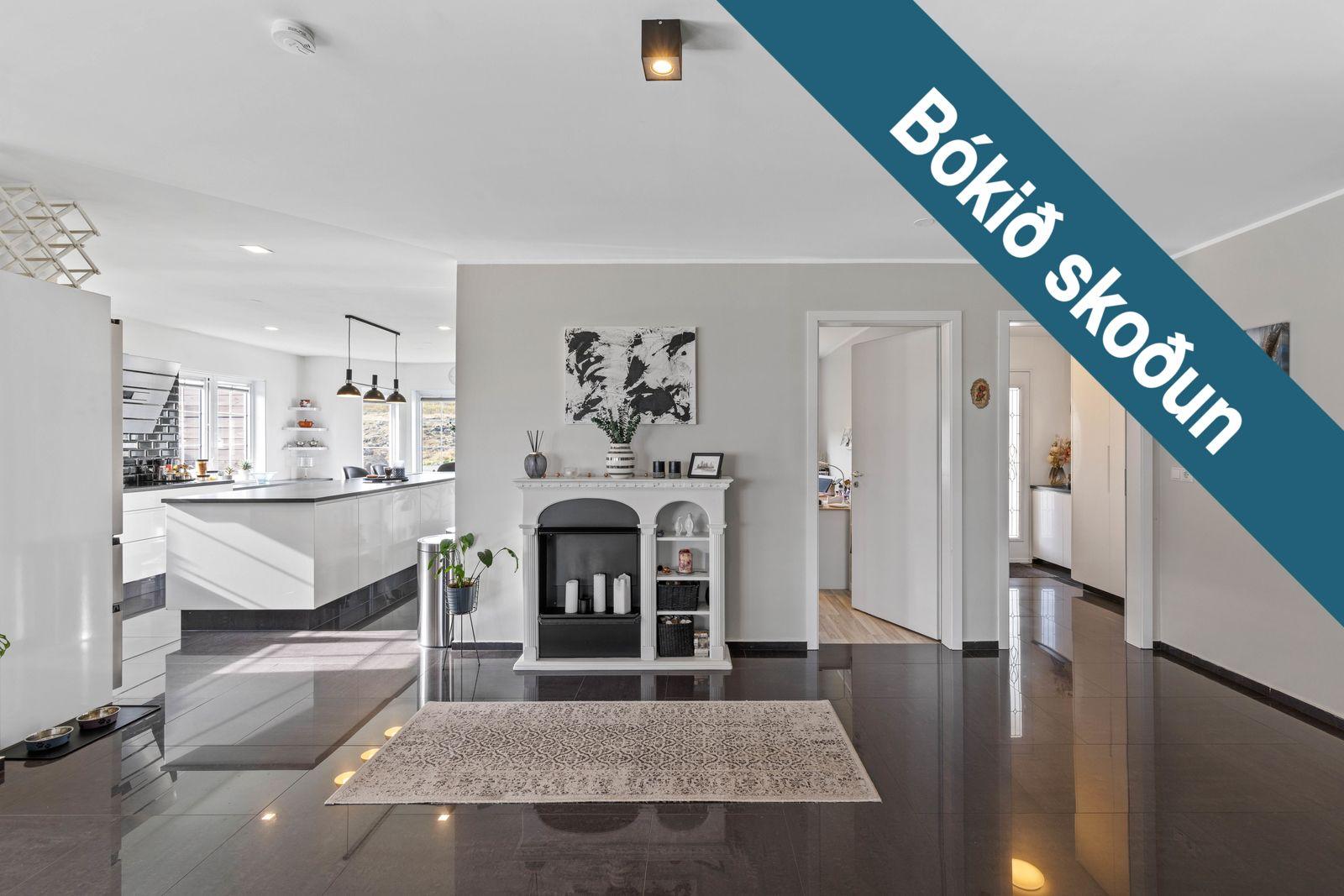 Sigurjon@allt.isEignin skiptist í forstofu, stofu og eldhús í opnu rými, gengið út á stóran sólpall yfirbyggðan að hluta og heitur pottur. Herbergjagangur með gestasnyrtingu, rúmgóðu baðherbergi ásamt tveimur barnaherbergi. Hjónaherbergi með stóru fataherbergi sem getur líka verið fjórða barnaherbergið. Rúmgott þvottahús. Bílskúr tvöfalldur, lakkað gólf og felli stigi upp á risloft.Forstofa: Rúmgóð. Svartar flísar á gólfi. Útihurð með skrautgleri í. Góðir skápar. Millihurð með gleri.