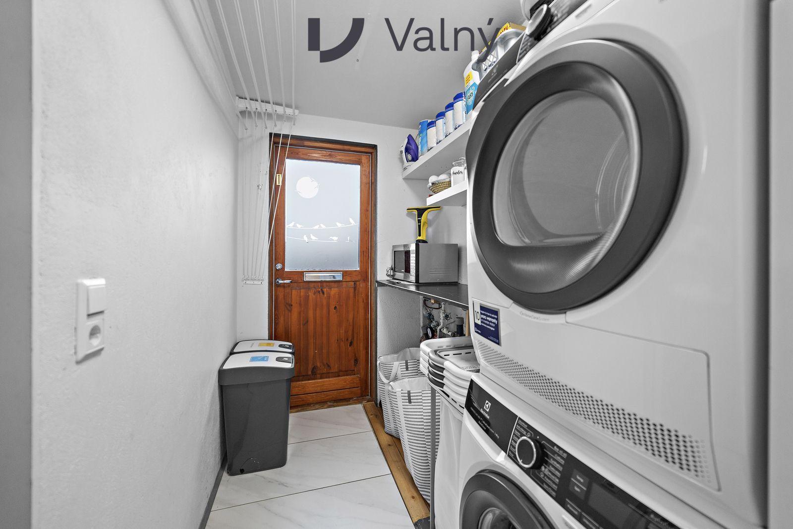Þvottahús með flísalögðu gólfi, innangengt á gestasalerni, útgengt á verönd.