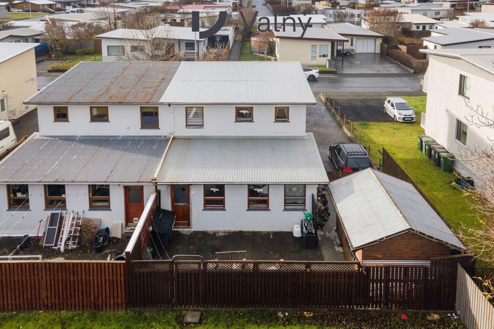 Lóð og aðkoma:Tyrfður garður og timburverönd að framan. Að aftan er steypt og hellulögð verönd. Stór steypt innkeyrsla og rúmgóður geymsluskúr á lóð.