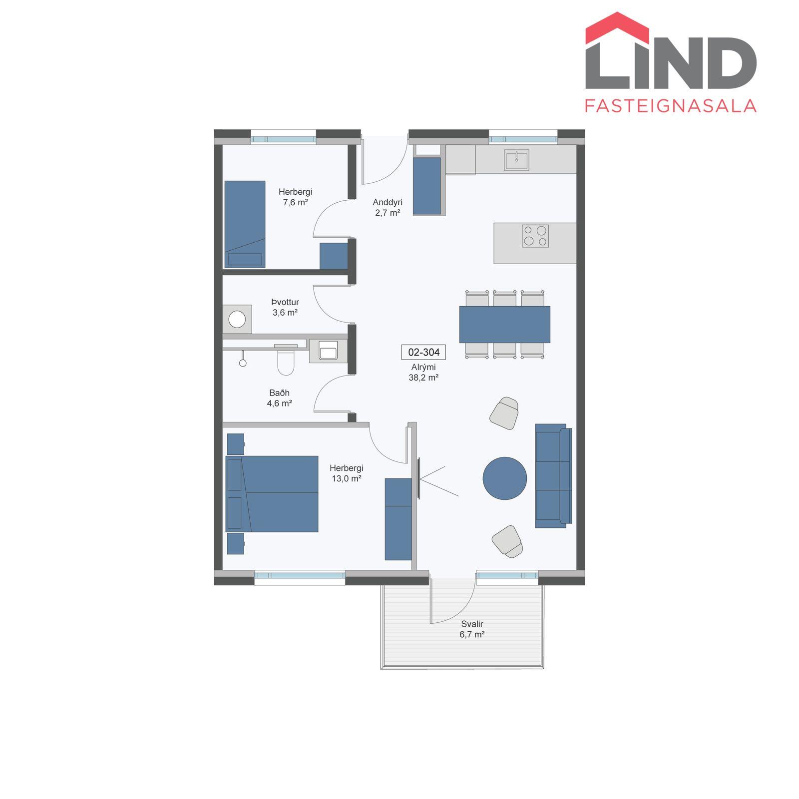 Íbúð 304: Er 92,2 fermetra 3ja herbergja íbúð á þriðju hæð með góðum 6,7 fermetra svölum. Þar af er geymsla 12,0 fermetrar. Afhending er áætluð í mars/apríl 2026 en þó með fyrirvara um að öryggisúttekt sé komin á húsið.