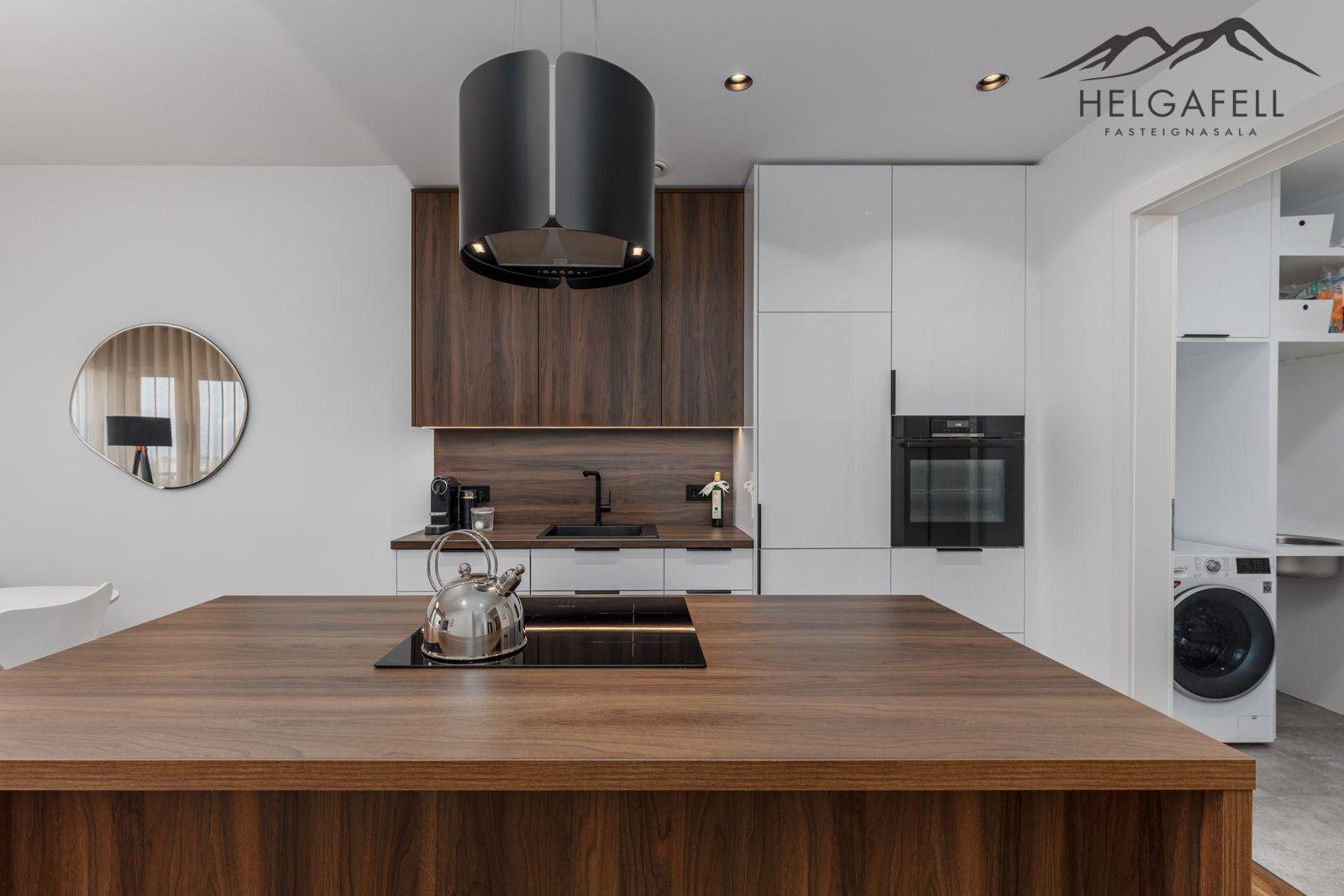 Eldhús: Í alrými með stofu, falleg innrétting, eyja með spanhelluborði og upphengdum háf, skúffur í eyju, gert er ráð fyrir að hægt sé að sitja við eyjuna, innbyggður ísskápur og uppþvottavél, bakaraofn, parket á gólfi.