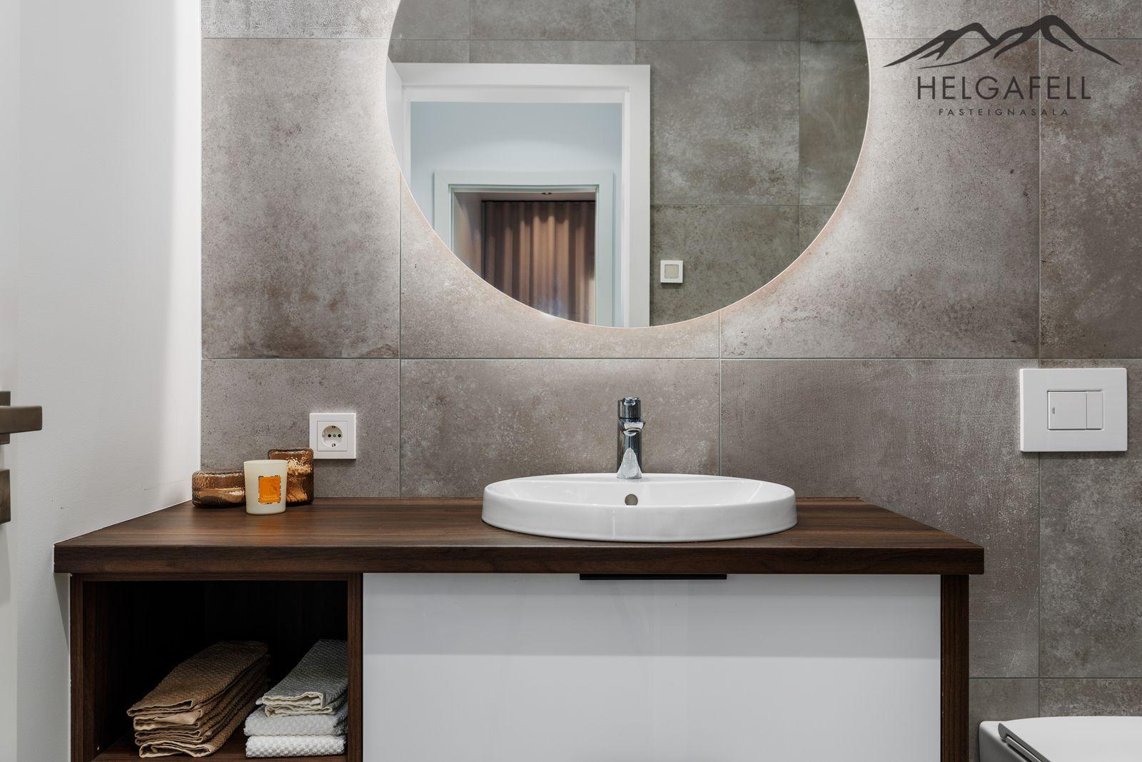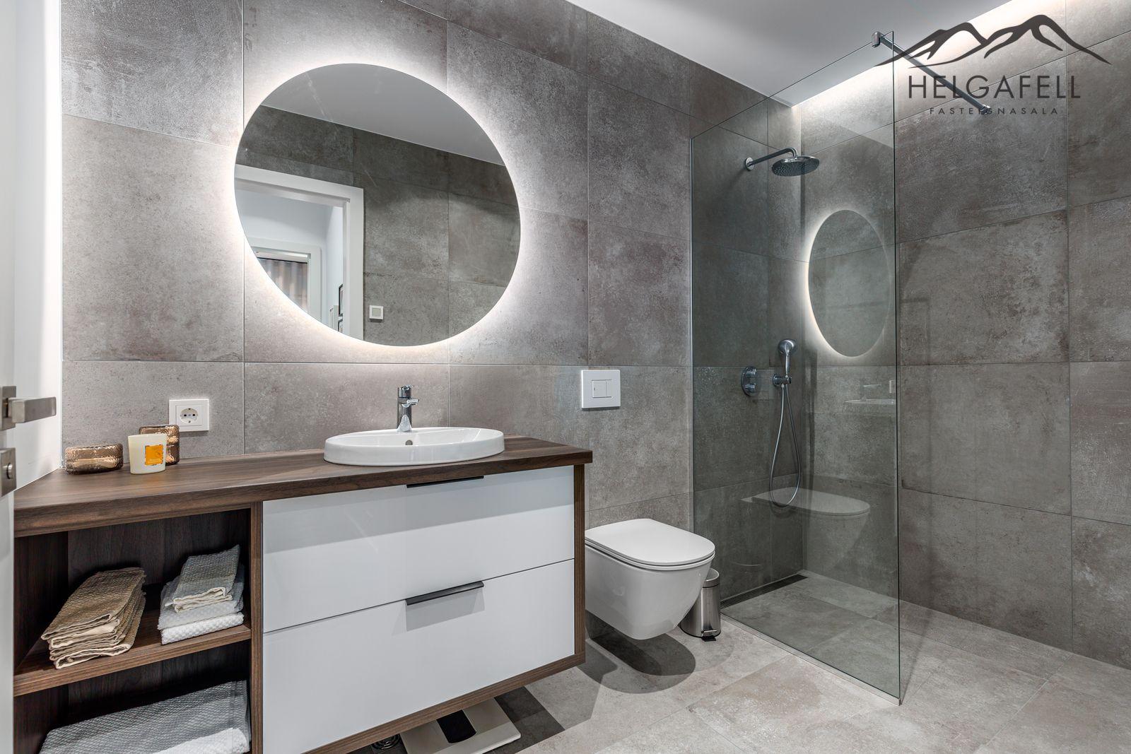 Baðherbergi: Með fallegri baðinnréttingu, ljósaspegill, walk in sturta með innbyggðum blöndunartækjum, upphengt salerni, handklæðaofn, flísalagt í hólf og gólf.