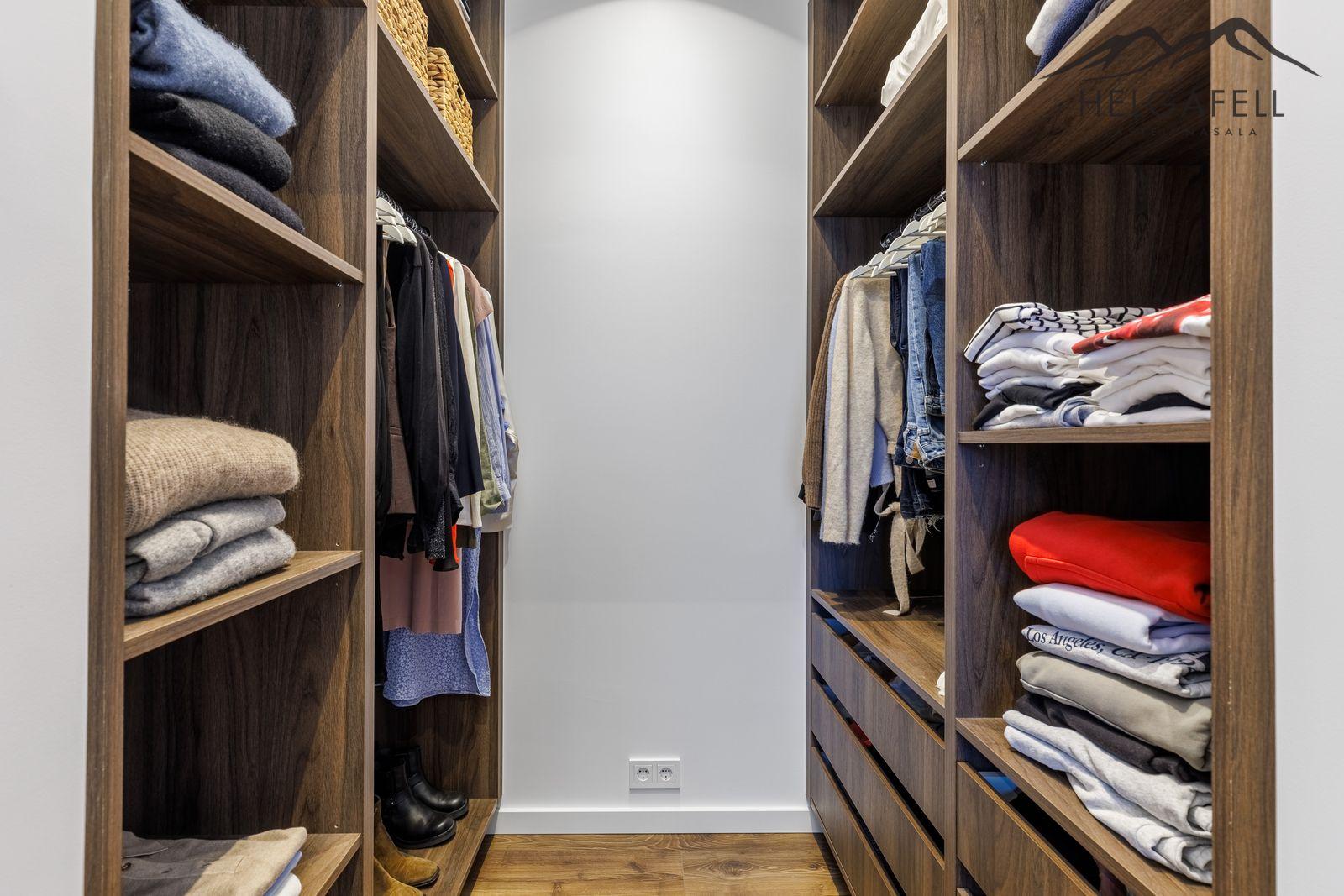 Hjónaherbergi: Stórt hjónaherbergi með fataherbergi, gólfsíður gluggi, parket á gólfi.