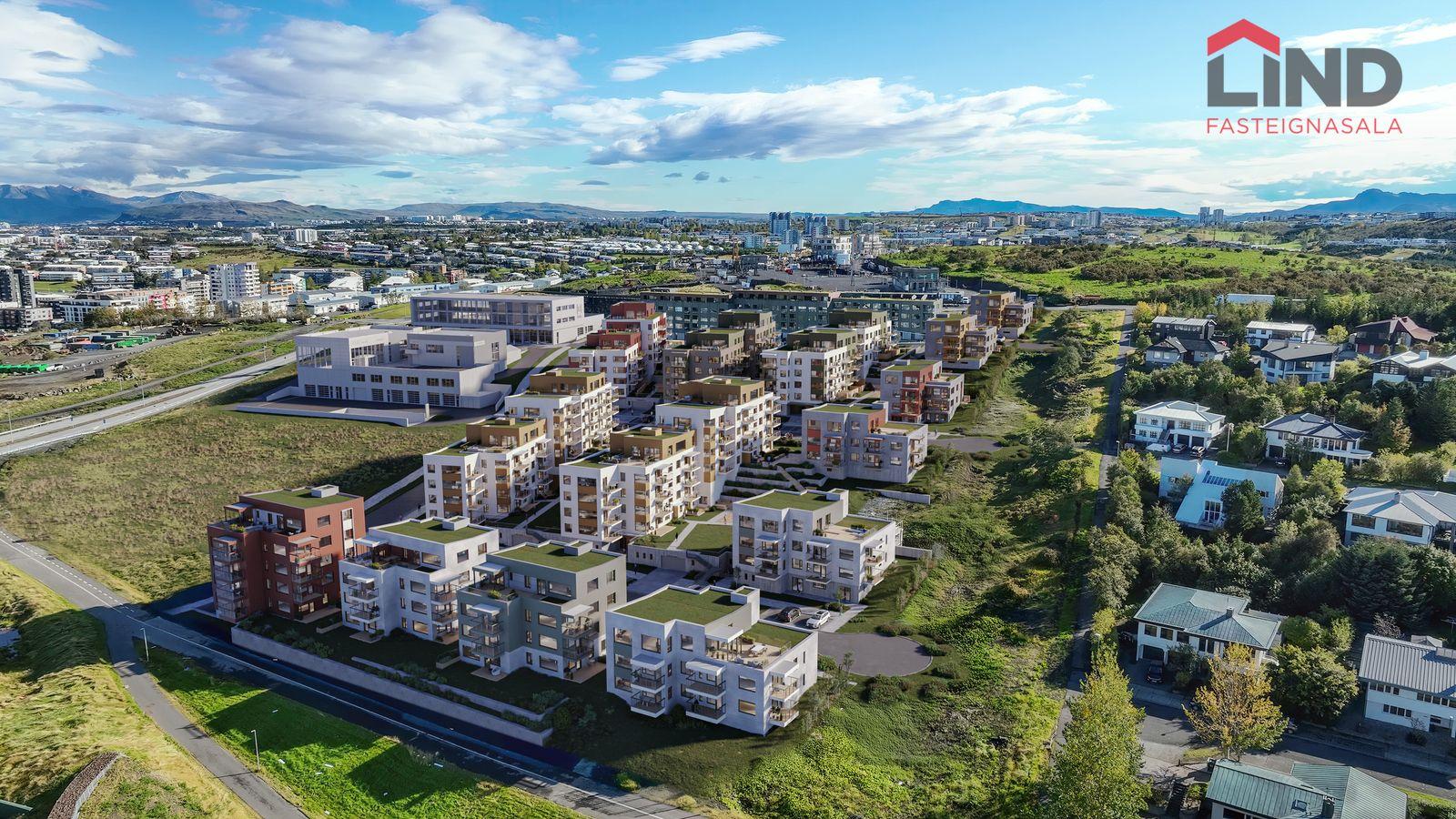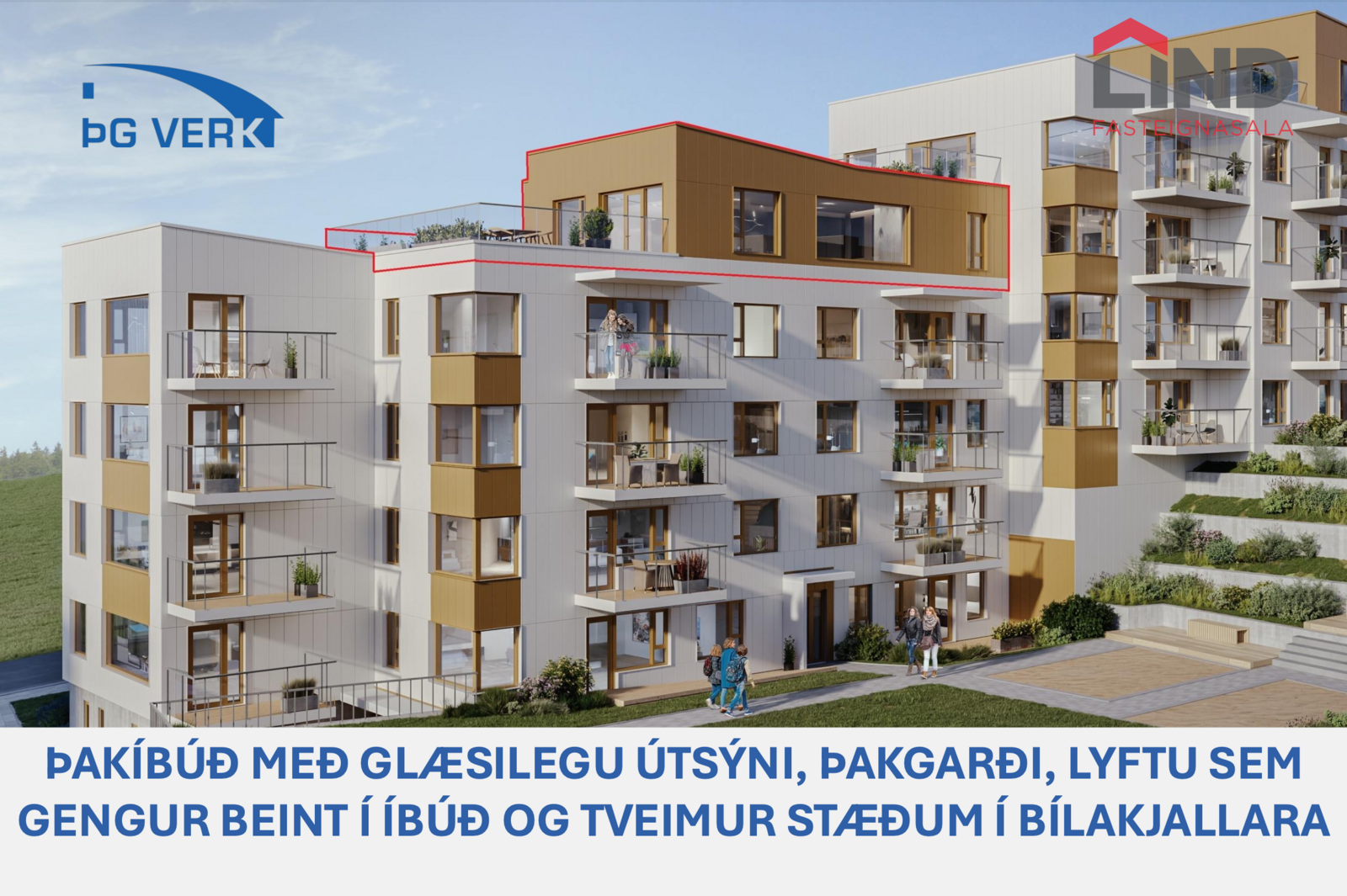 Íbúð 503: Er glæsileg 171,0 fermetra 3ja - 4ra herbergja penthouse íbúð á 5. hæð með stórum 59,4 fermetra þaksvölum til suðurs og tveimur sérmerktum bílastæðum í lokuðum bílakjallara. Tvær góðar geymslur fylgja íbúðinni sem eru 21,7 fermetrar og 10,1 fermetrar að stærð. Afhending er í mars-apríl 2026 með fyrirvara um að öryggisúttekt sé komin á húsið.