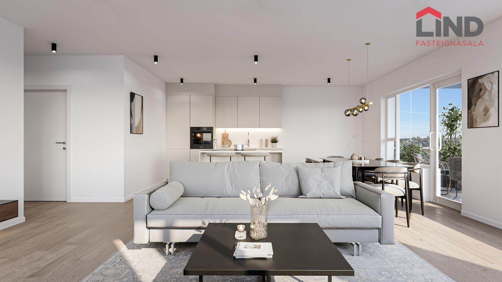 Nánari lýsing: Íbúðin skiptist í forstofu, eldhús í alrými með eyju sem er opið við stofu/borðstofu, 2 svefnherbergi (möguleiki á 3 svefnherberginu), 2 baðherbergi og þvottaherbergi. Útgengt á svalir frá stofu.