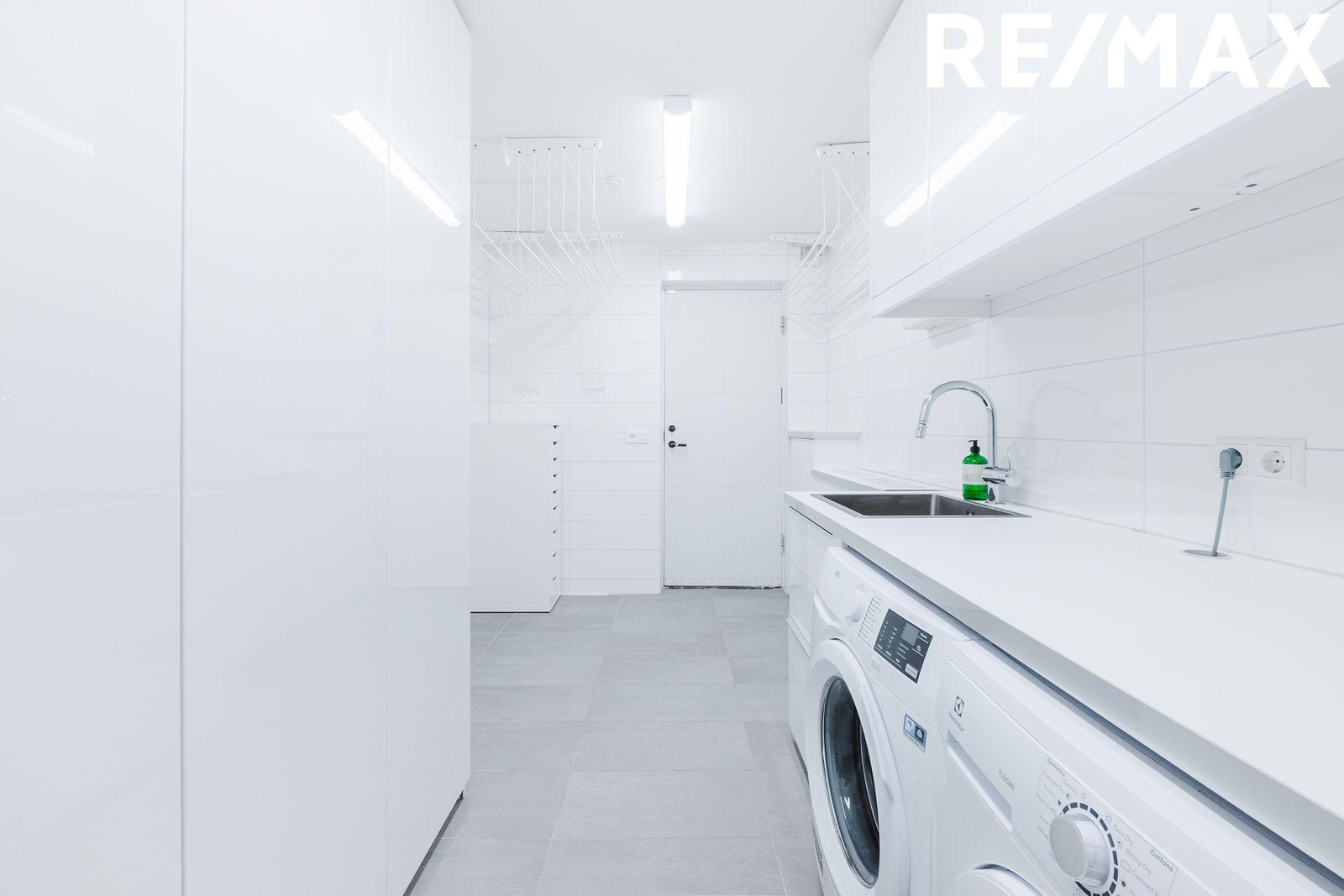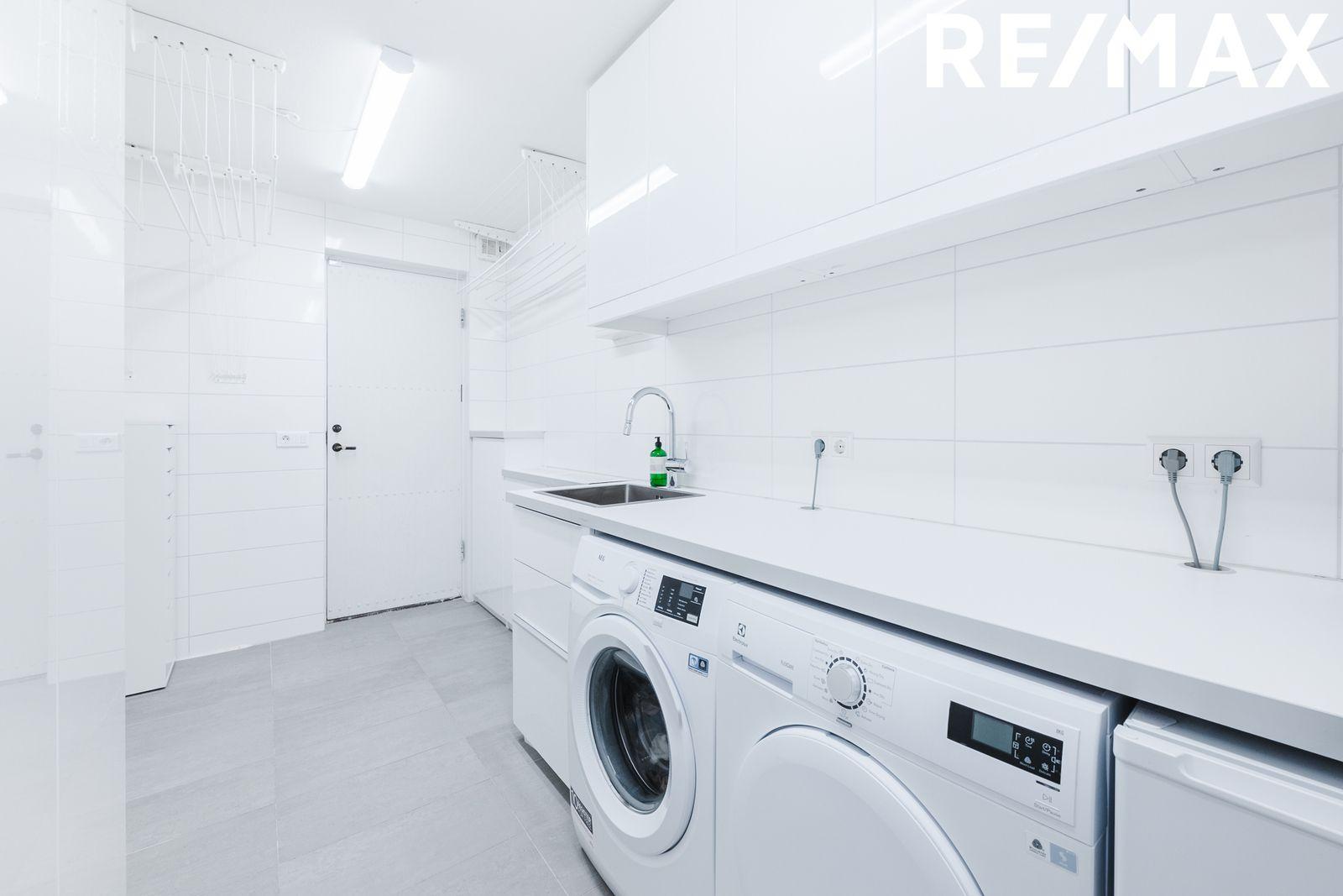 Þvottahús er með flísum á gólfi, góðum innréttingum með góðu skápaplássi, vaski og vinnuborði. Útihurð er í þvottahúsi sem hægt er að nota sem annan inngang í húsið.