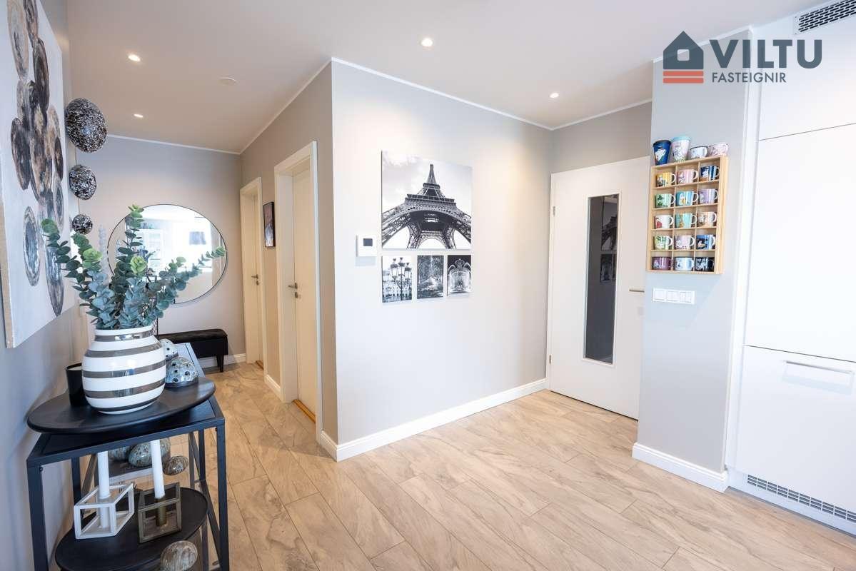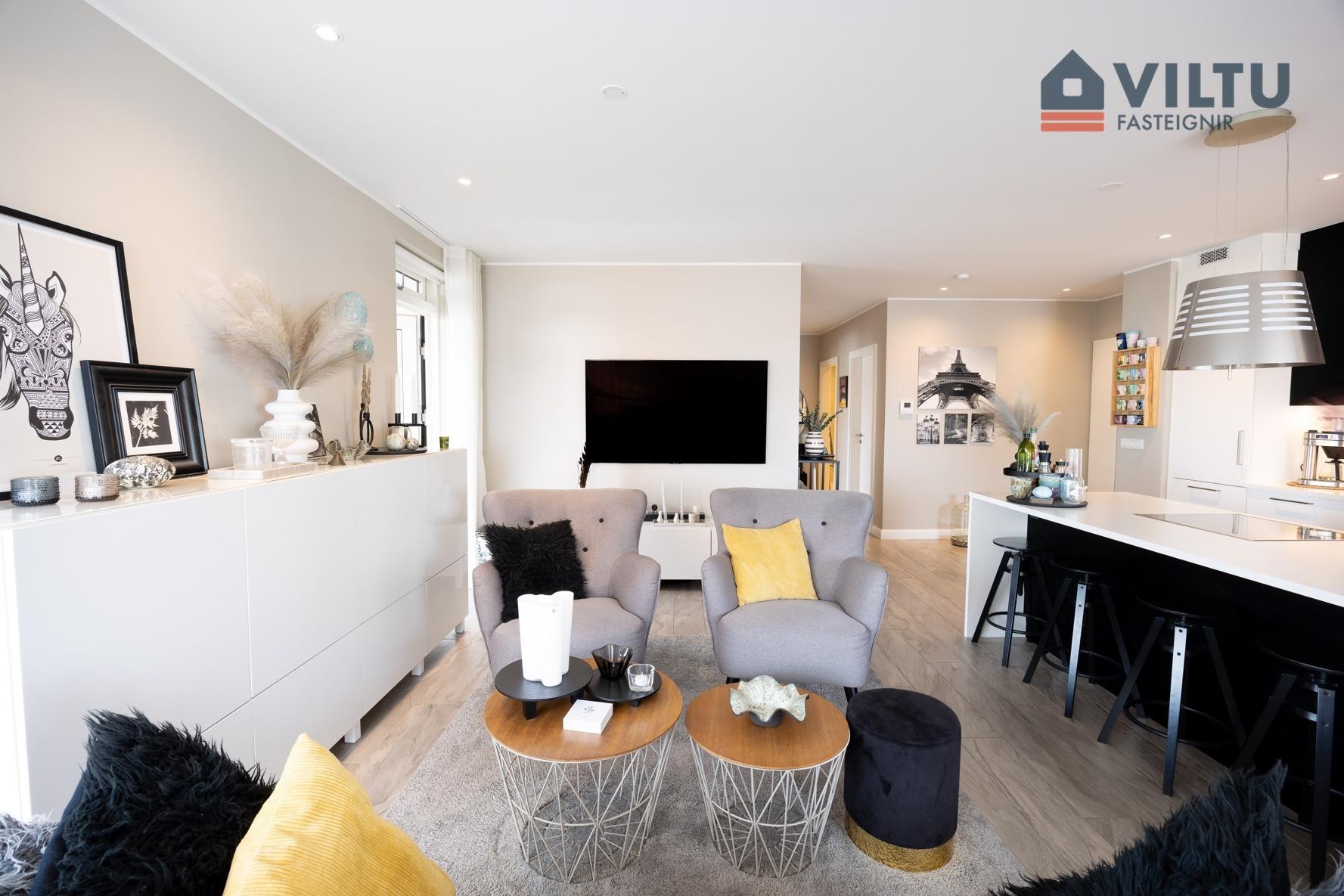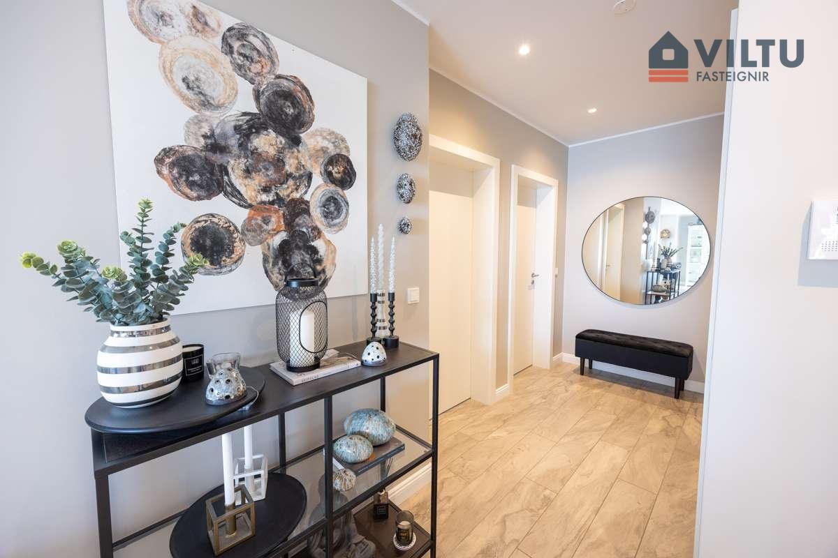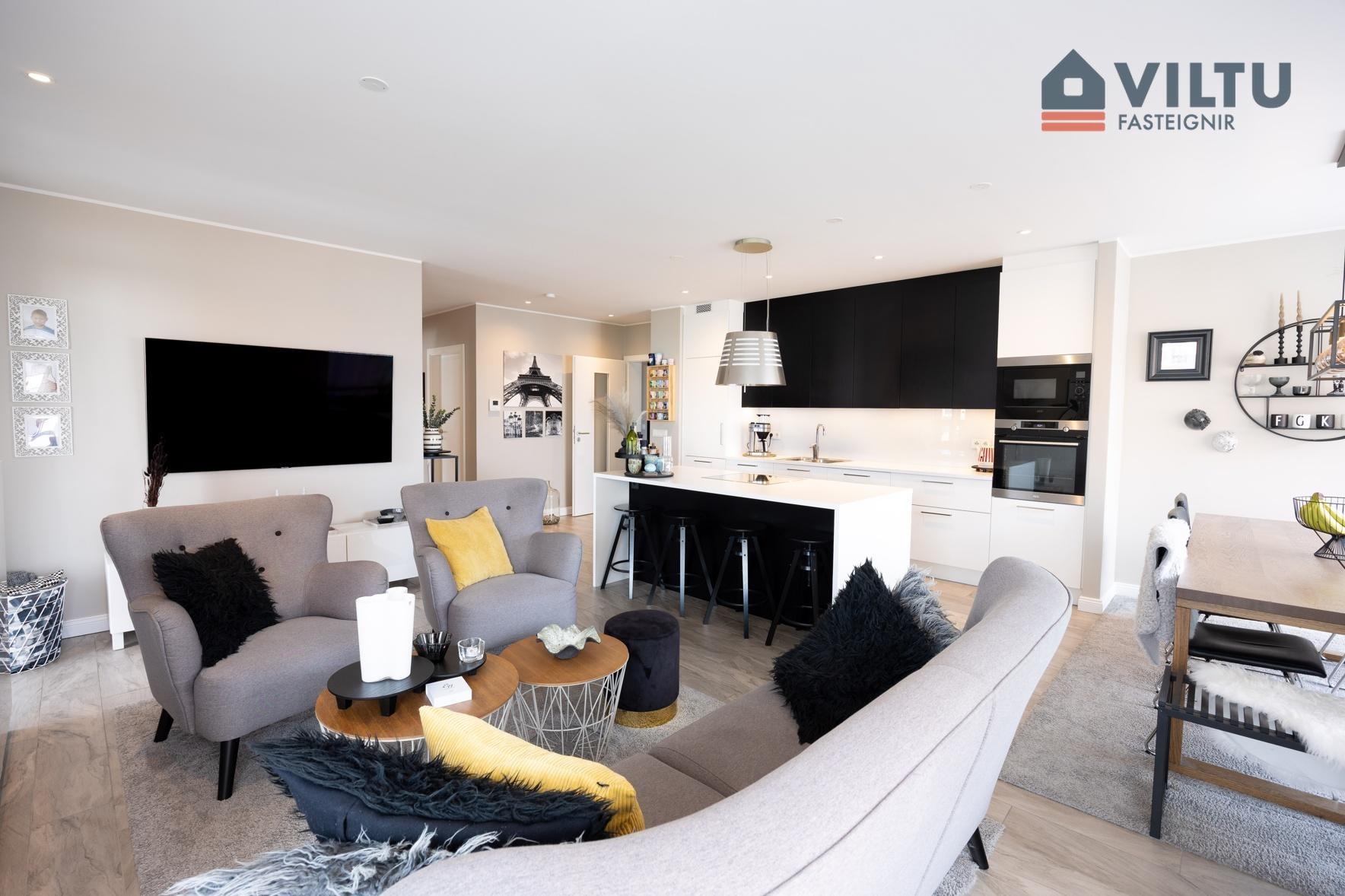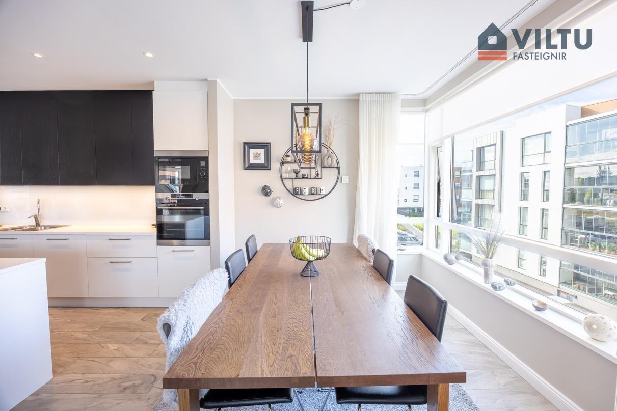 Viltu fasteignir kynna glæsilega íbúð við Naustavör 9, Kópavogi. Um er að ræða fallega 135,9 fm endaíbúð í fjögura hæða glæsilegu lyftuhúsi með einum stigagangi við sjóinn í Kópavogi. Útsýnisgluggar út yfir sjóinn að Nauthólsvíkinni og Esjunni. Áætluð göngubrú mun tengjast yfir í Nauthólsvíkina að miðbæ Reykjavíkur. Íbúðin skiptist í forstofu, eldhús, stofu og og samliggjandi borðstofu, þrjú svefnherbergi þar sem er eitt þeirra forstofuherbergi, baðherbergi og þvottaherbergi innan íbúðar ásamt rúmgóðri sérgeymslu í sameign á neðstu hæð. Sérstæði í bílageymslu með sér hleðslustöð, í stæðinu fyrir rafmagnsbíl. Sérlega falleg íbúð fyrir vandláta. er byggt árið 2019 af Byggingarfélagi Gylfa og Gunnars, sérsmíðaðar innréttingar frá Brúnás og góð tæki.