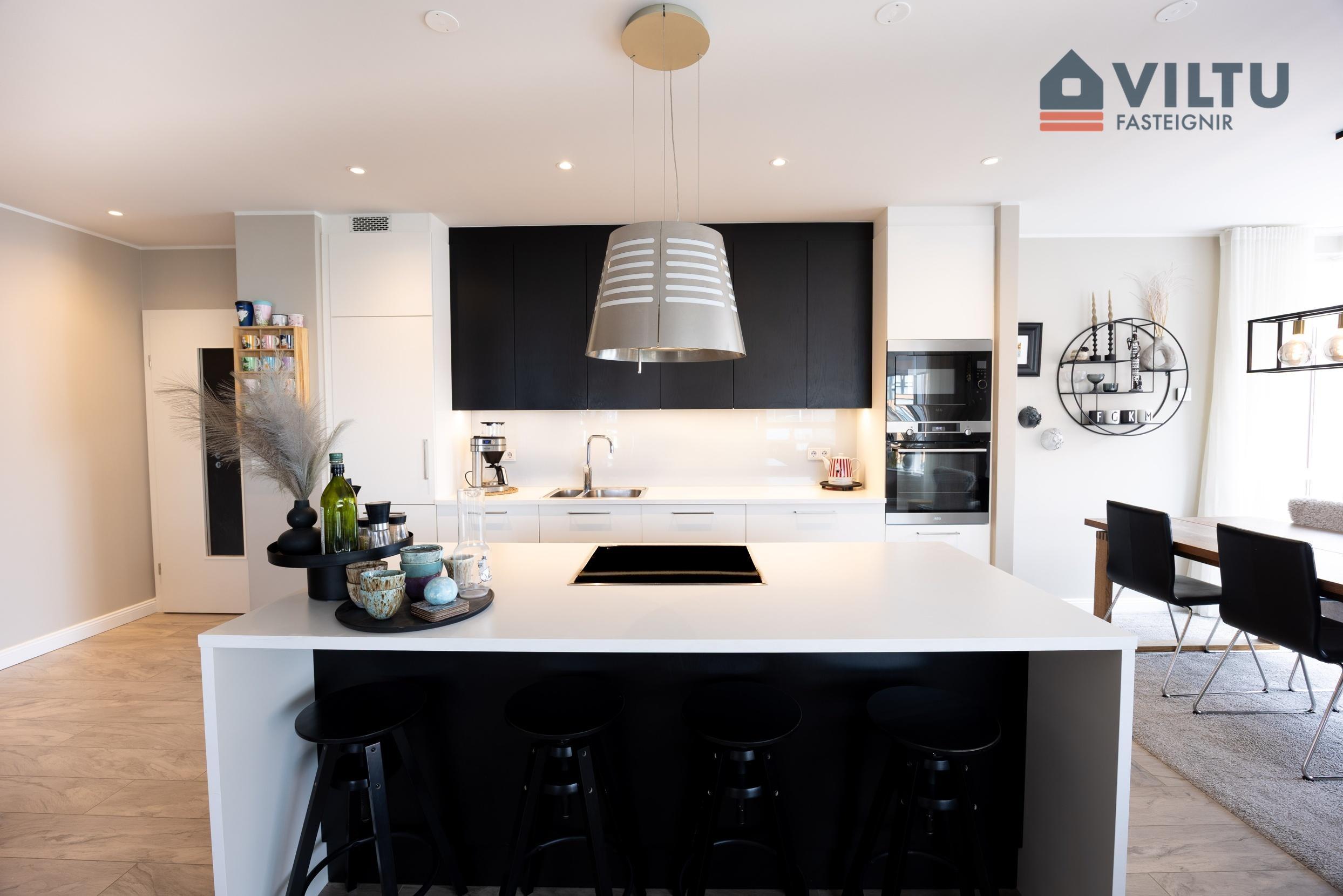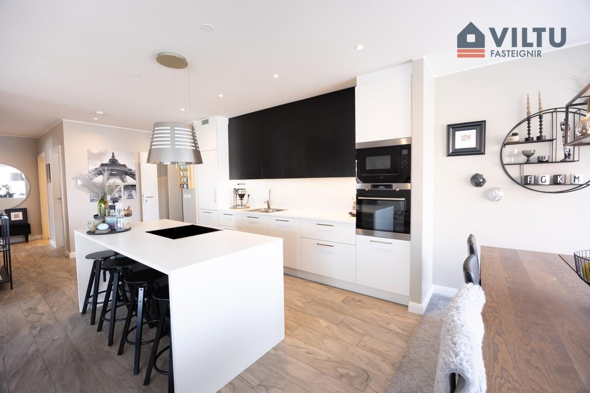 Eldhús er bjart með innréttingu frá Brúnás með skápum til lofts, mjög rúmgóð og stórri eyju með skúffum. Span eldavél er í eyju, vifta fyrir ofan. Í innréttingu er innbyggður ísskápur með klakavél, uppþvottavél, ofni og örbylgjuofni. Eldhústæki eru frá AEG.