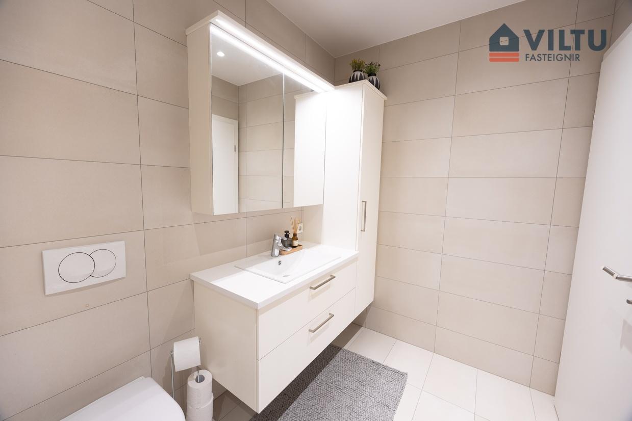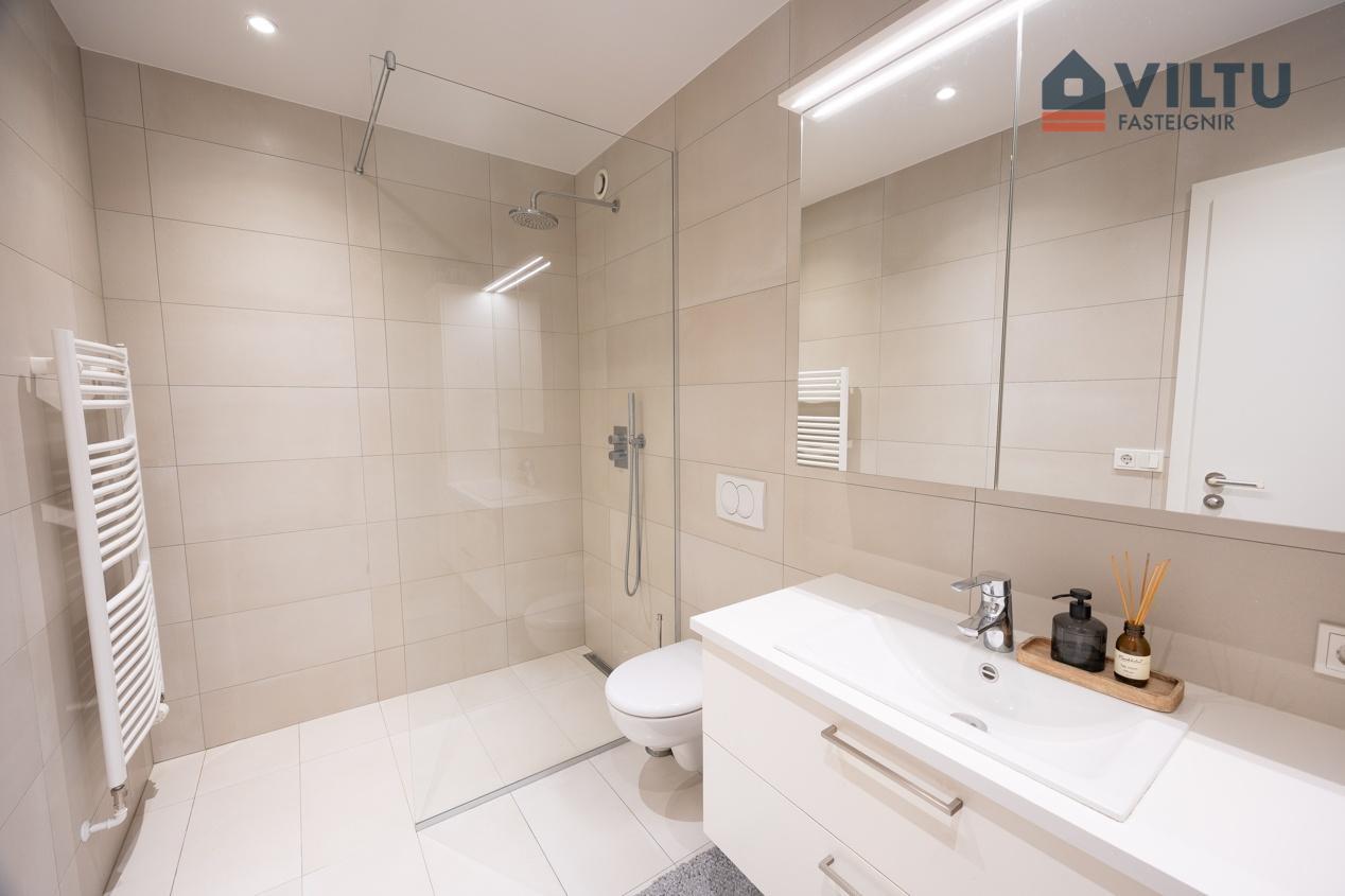 Baðherbergi er rúmgott. Stór walk-in sturtuklefi með gler skilrúmi, upphengt salerni og handklæðaofni. Góð innrétting með lýsingu.