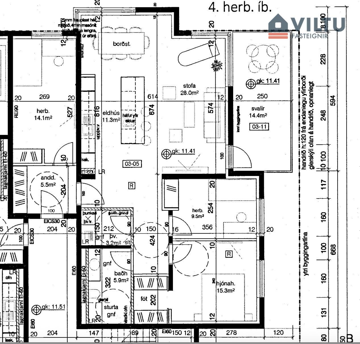 Stofa er sérlega björt með gluggum á tvo vegu með útsúni, hornglugga og útgang á stórar (14,5 m2) yfirbyggðar svalir.