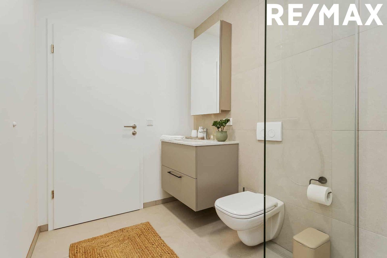Baðherbergi I: með Walk-in sturtu, flísum á gólfi og á hluta af veggjum. Handklæðaofn, upphengt salerni, baðinnrétting með handlaug og spegil.