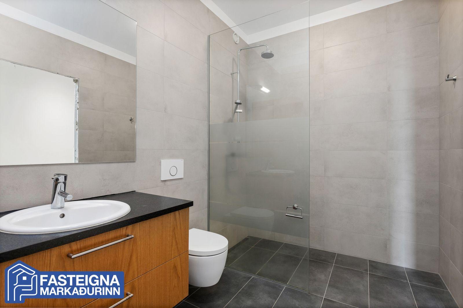 Baðherbergi, rúmgott, flísalagt gólf og veggir, handklæðaofn, innrétting, vegghengt wc og stór flísalögð gólfsturta með sturtugleri.