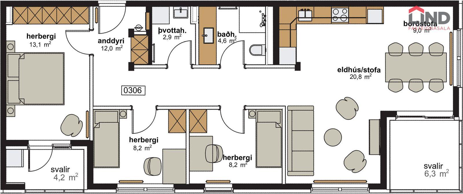 Íbúð 306 er fjögurra herbergja með þvottahúsi og bílastæði í kjallara.