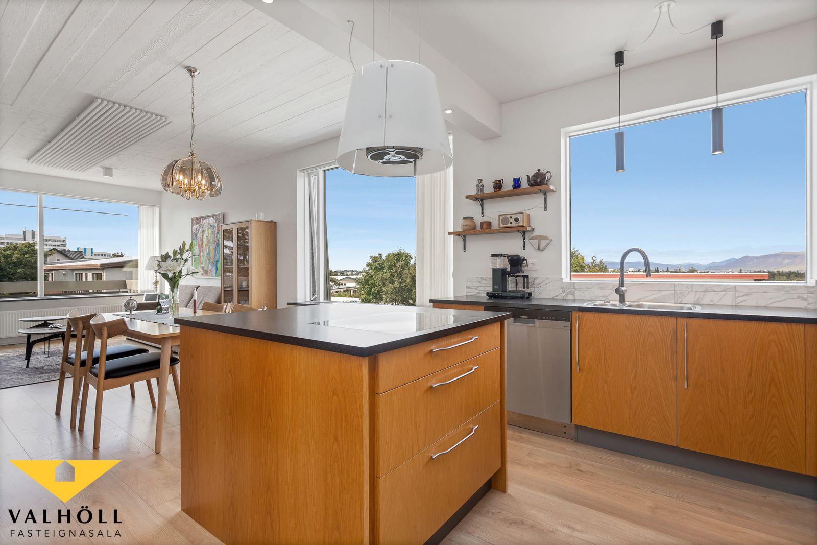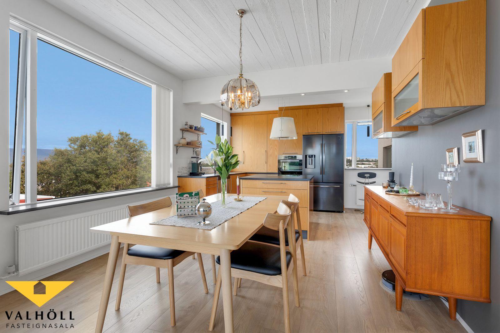 Eldhús:  Opið við stofu, parket á gólfi, eikar innrétting,  eyja með spanhelluborði, ofn í vinnuhæð, tvöfaldur ísskápur og uppþvottavél.