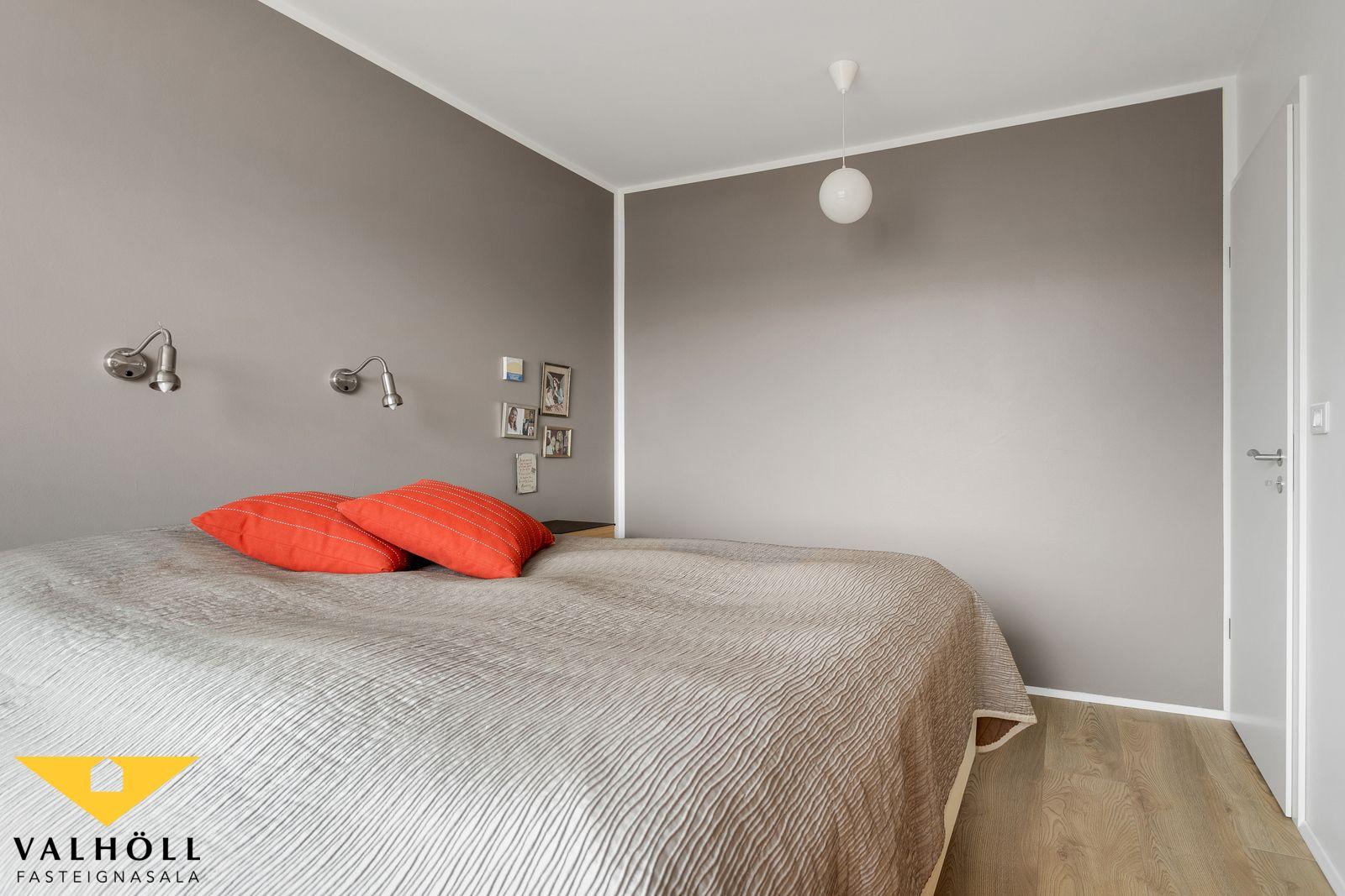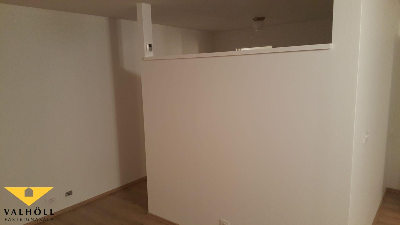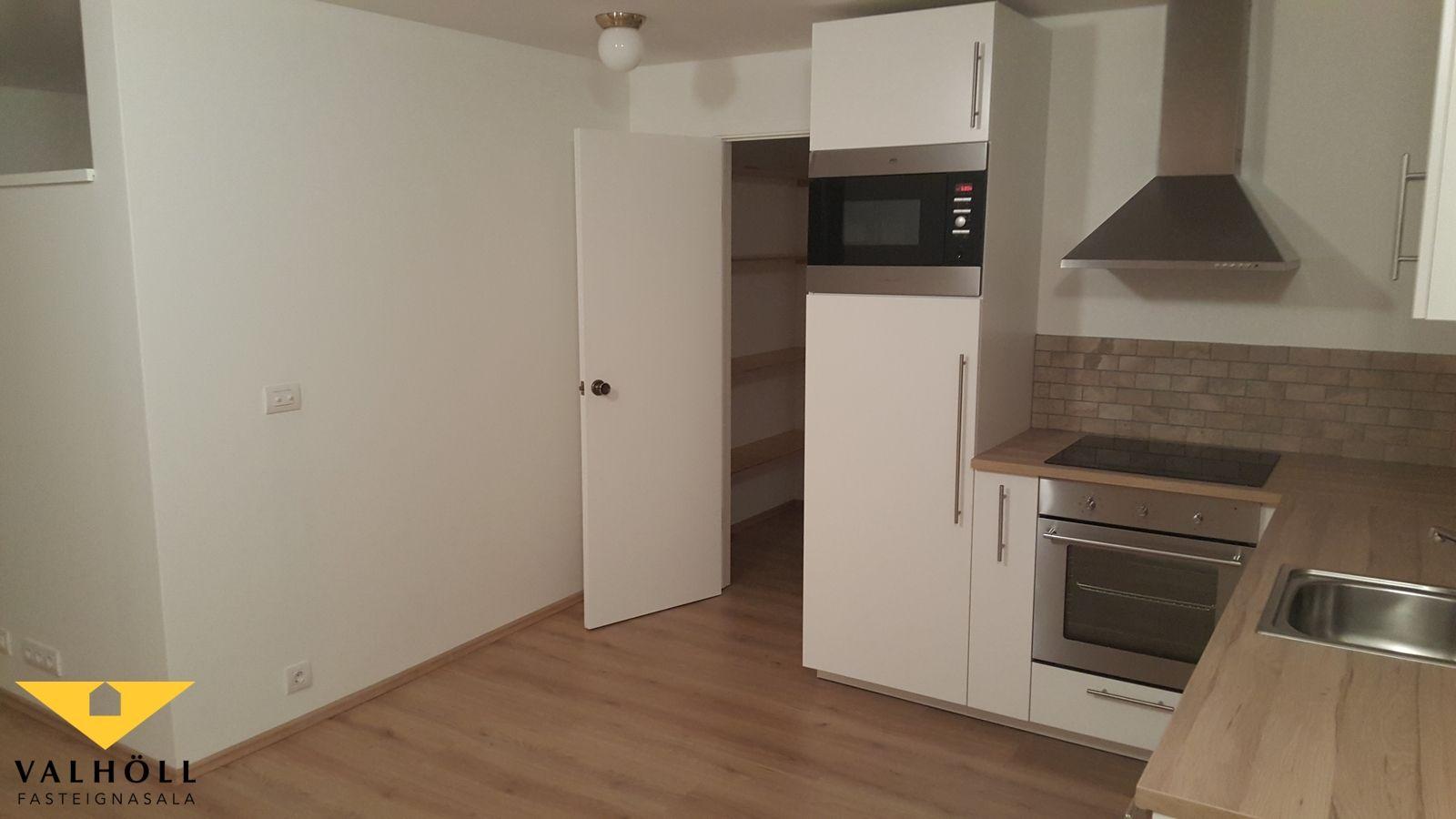 Miðrými: Parket á gólfi, flísar við útihurð og fataskápur.  Eldhúsinnrétting með, helluborði, viftuháf, ofn, uppþvottavél og ísskáp.  Góður geymsluskápur.