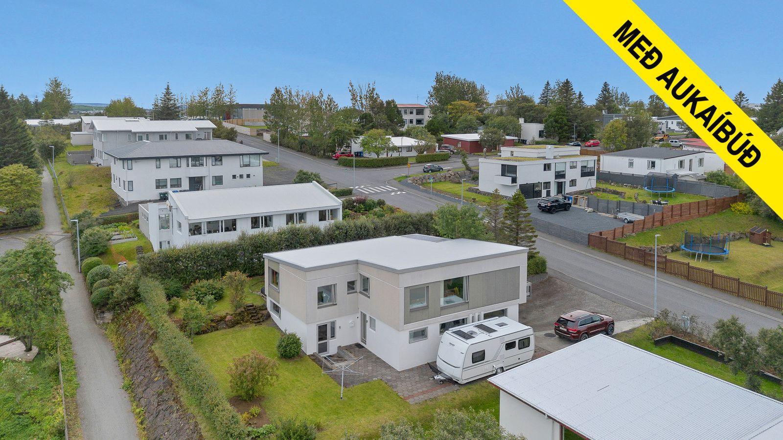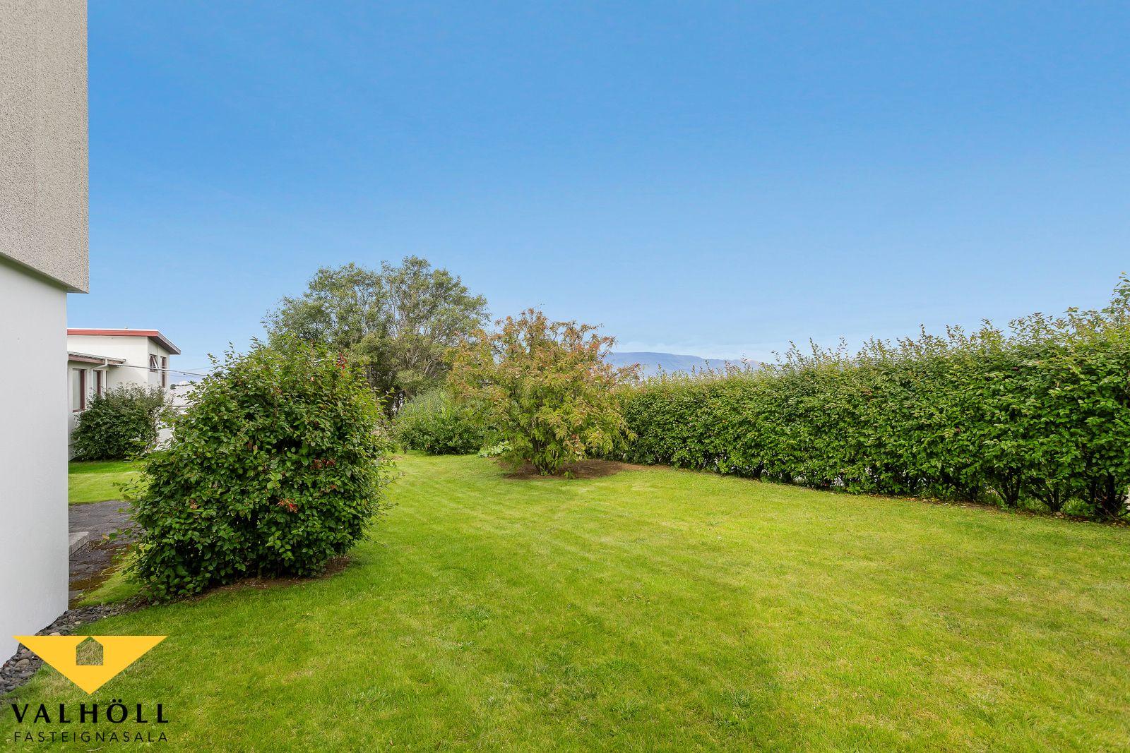 Bílskúr 28,2 fm er með rafdrifini hurð og hiti er í bílastæði framan við húsið og undir hellulagðri stétt meðfram húsinu.