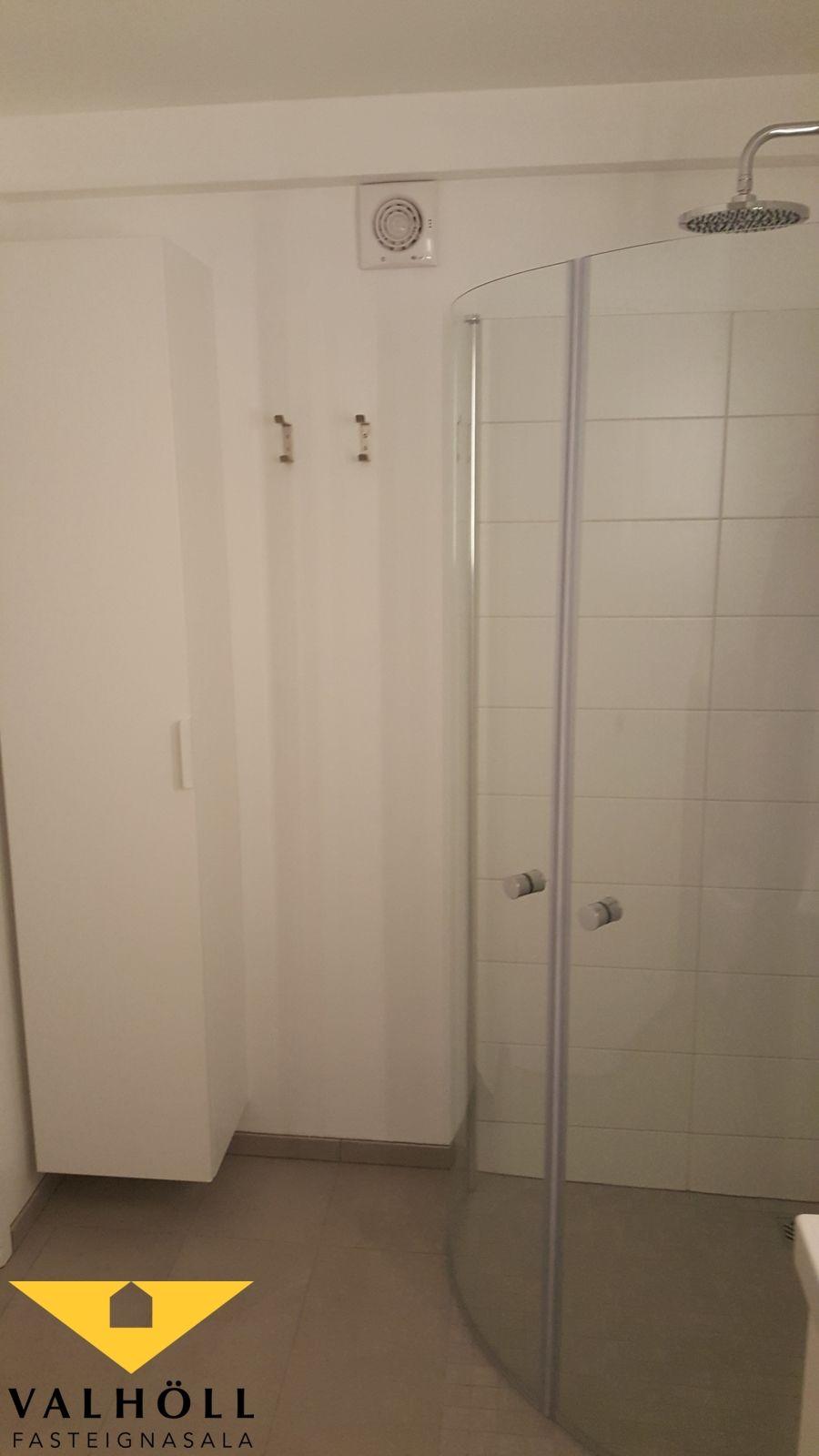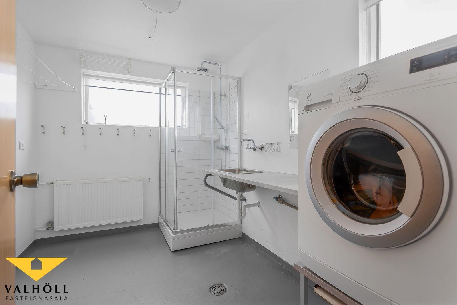 Þvottahús:   Rúmgott lakkað gólf, sturtuklefi, tengi fyrir þvottavél og þurrkara í vinnuhæð.