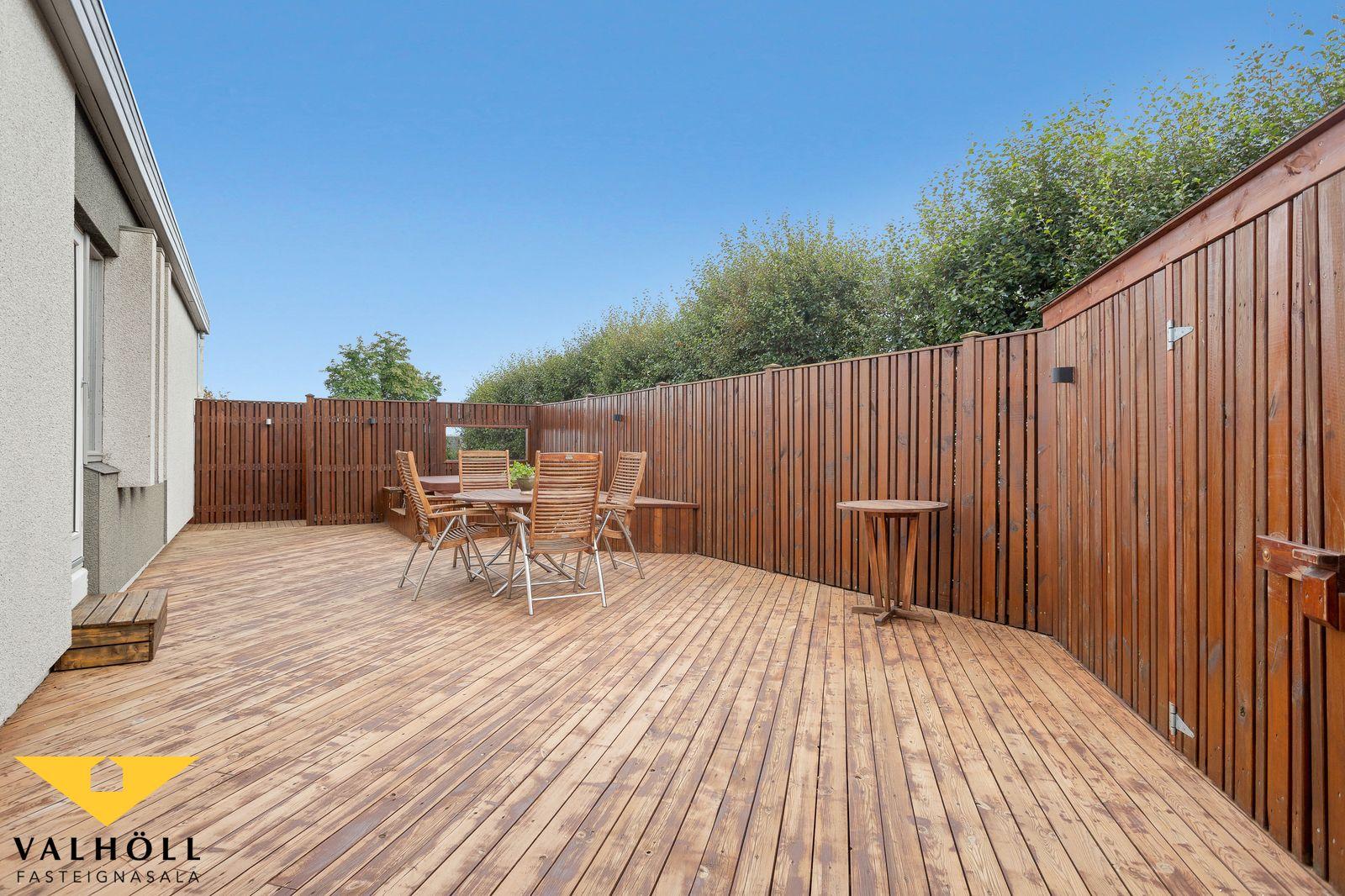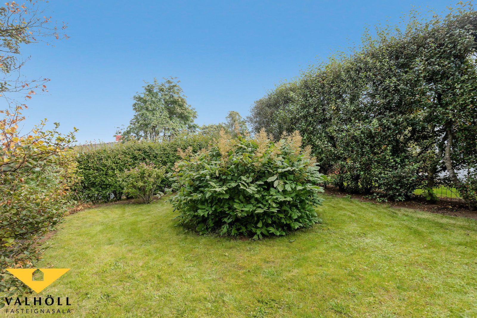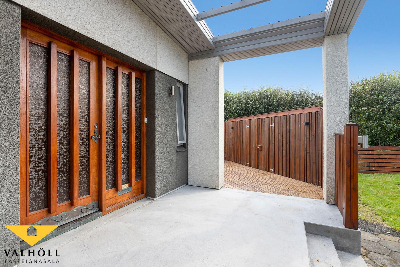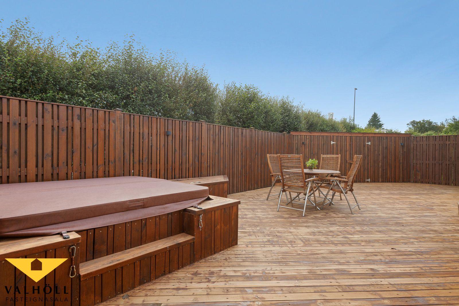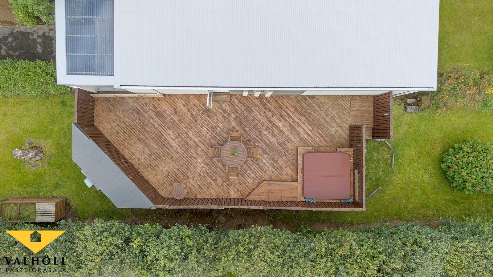 Stór suðurverönd tengist steyptri yfirbyggðri verönd við aðaldyr. Heitur pottur og garðáhaldageymsla eru á verönd. Lóð er fallega ræktuð með trjágróðri.