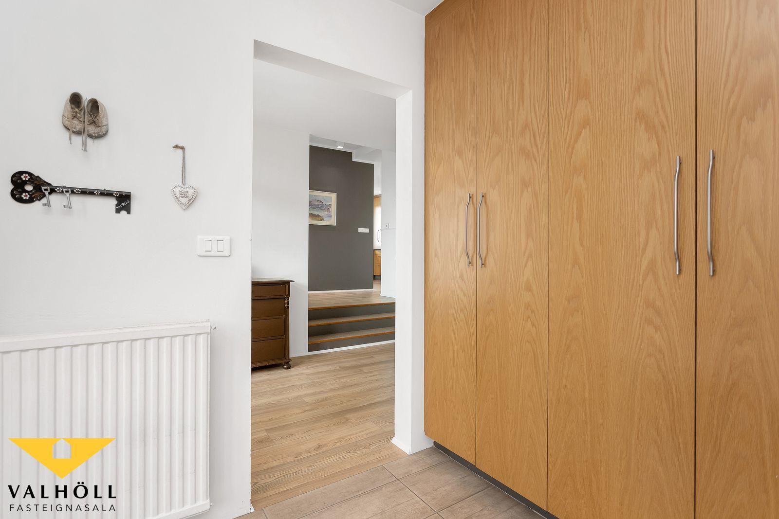 Efri hæð hússins er á 2 pöllum, inngangur er inn á neðri pallinn um yfirbyggða verönd.