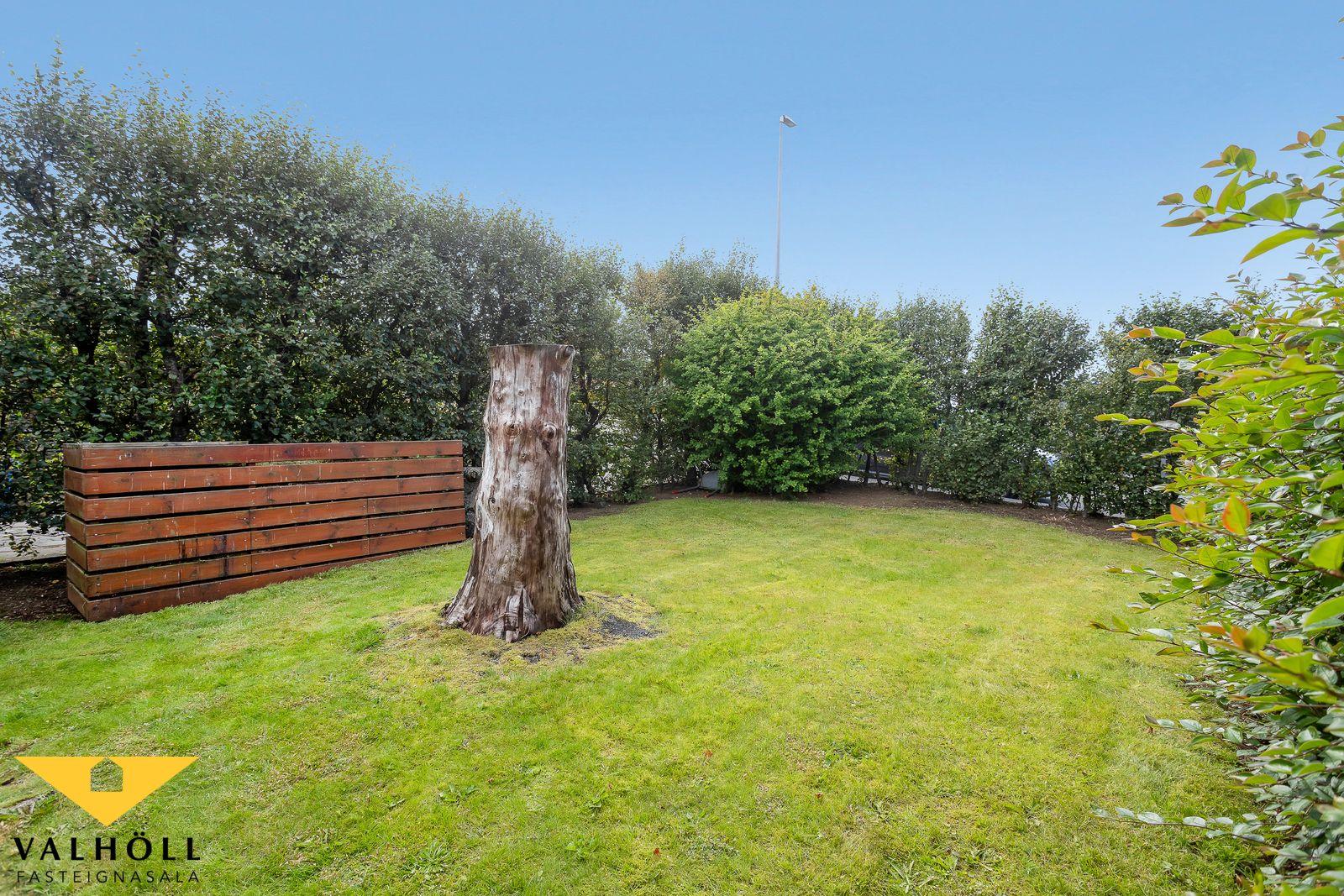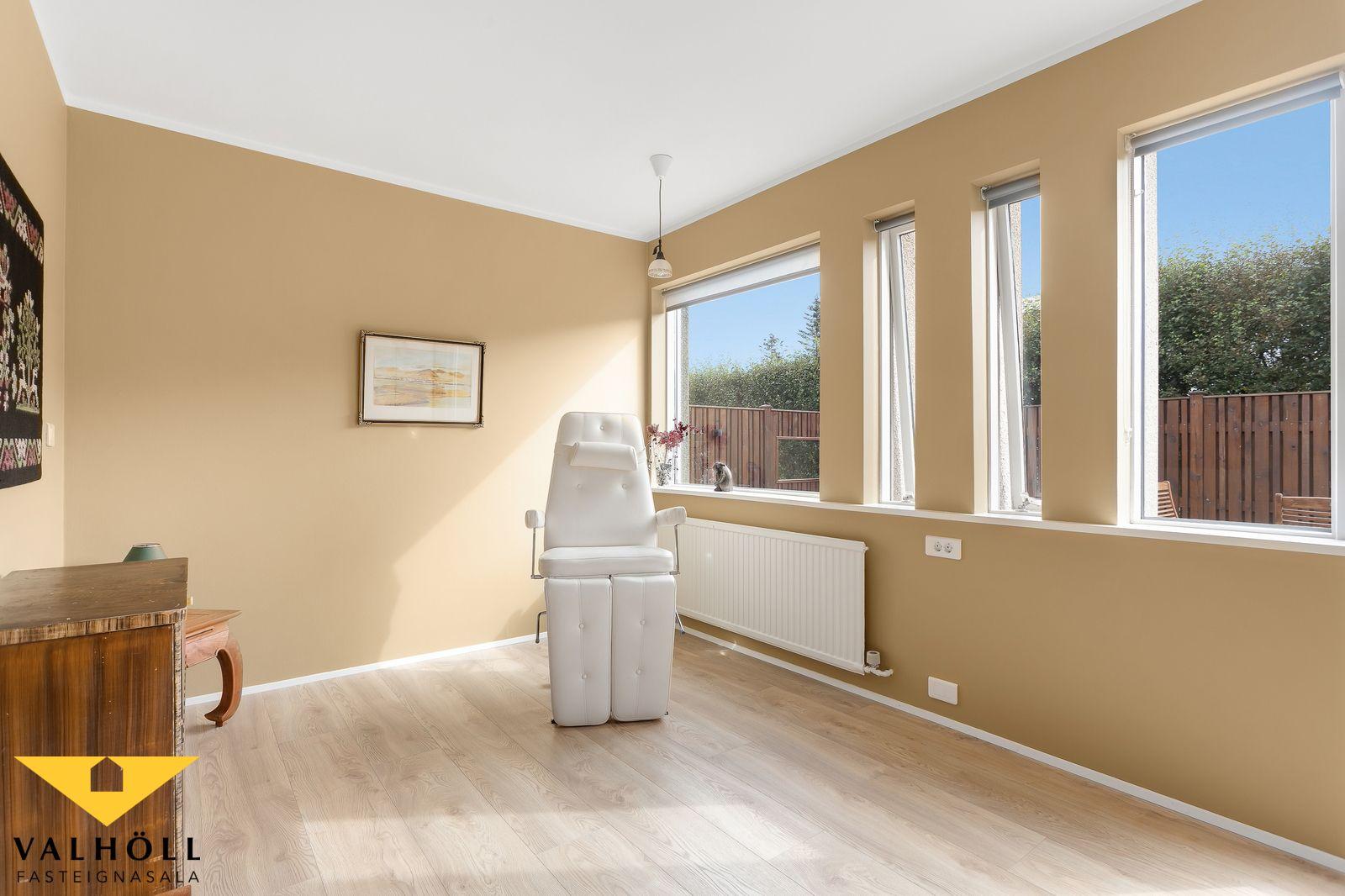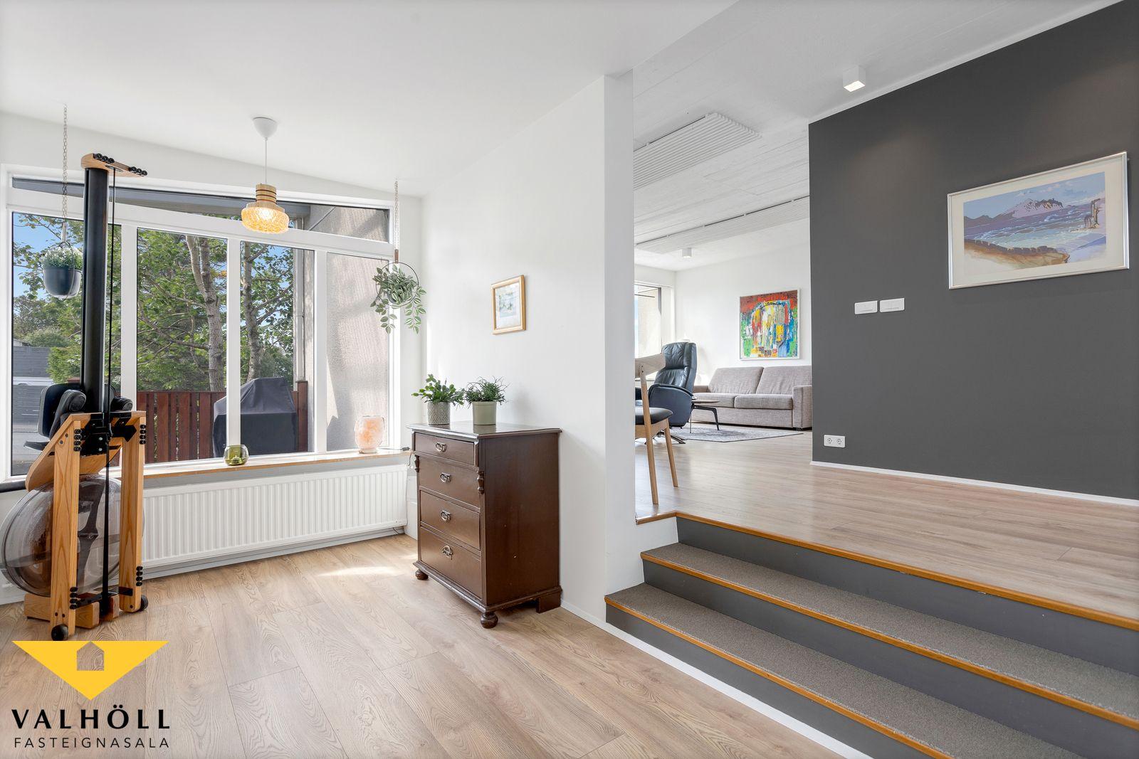 Þar eru anddyri, forstofu wc, hol, gangur, baðherbergi  og 3 rúmgóð  svefnherbergi en eru 4 á teikningu. Svalahurð út á verönd er úr herbergi. Þrjár tröppur eru upp í  bjart og rúmgott alrými sem er stofa, borðstofa og eldhús opið við stofu.