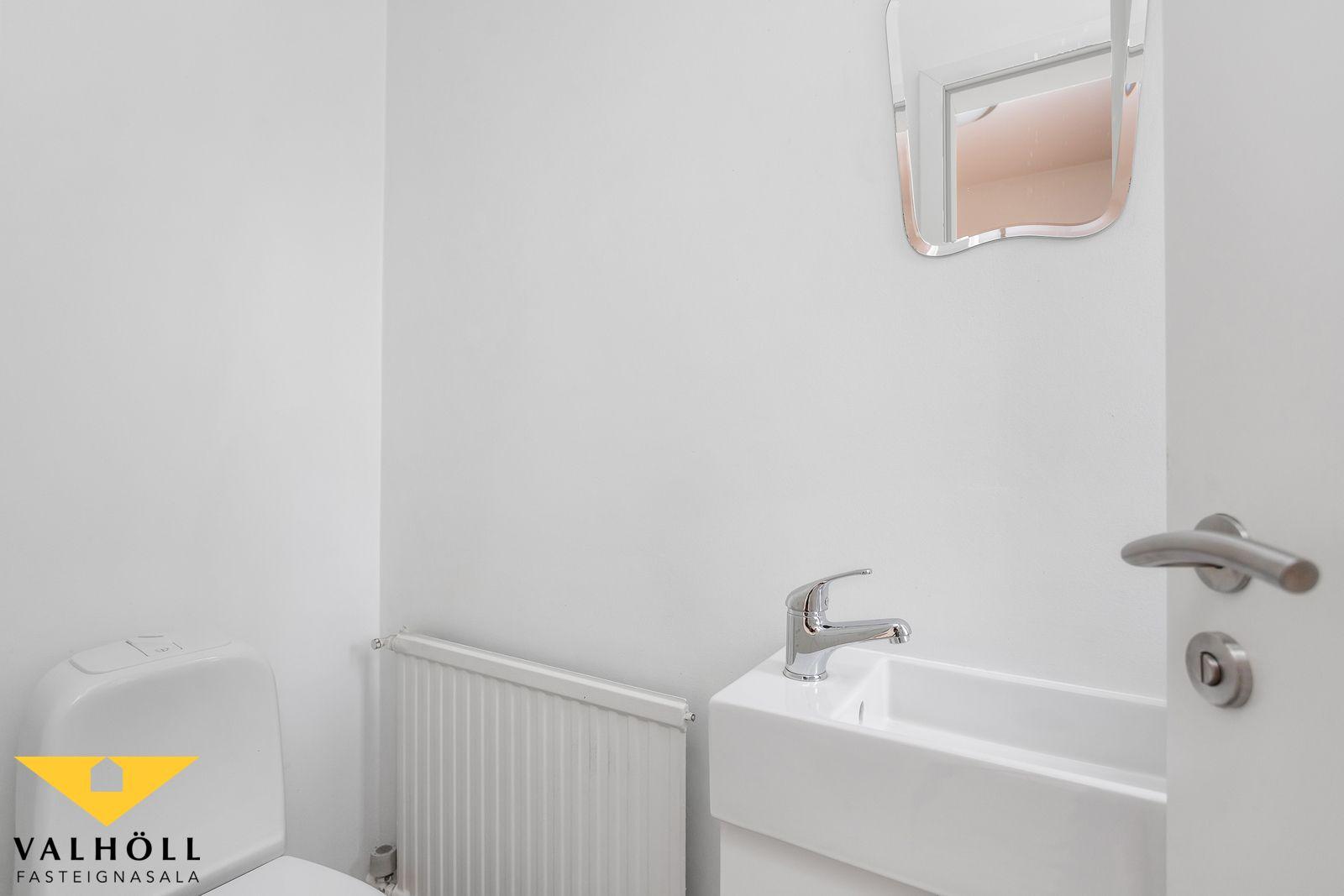 2018. Parket á herbergi á neðri hæð og endurnýjað innrétting og hreinlætistæki á wc.
