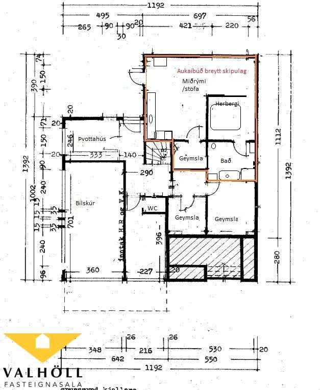 Upphaflegu skipulagi hefur verið breytt frá uppruanlegri teikning í hluta hússins.