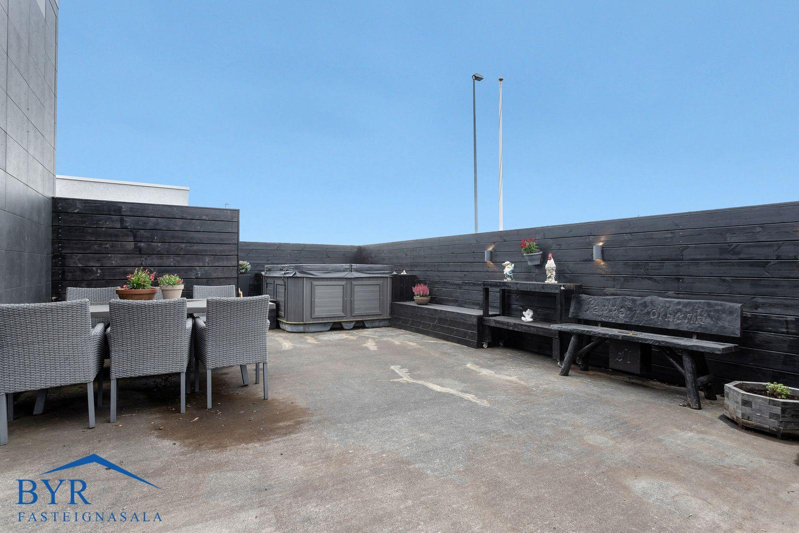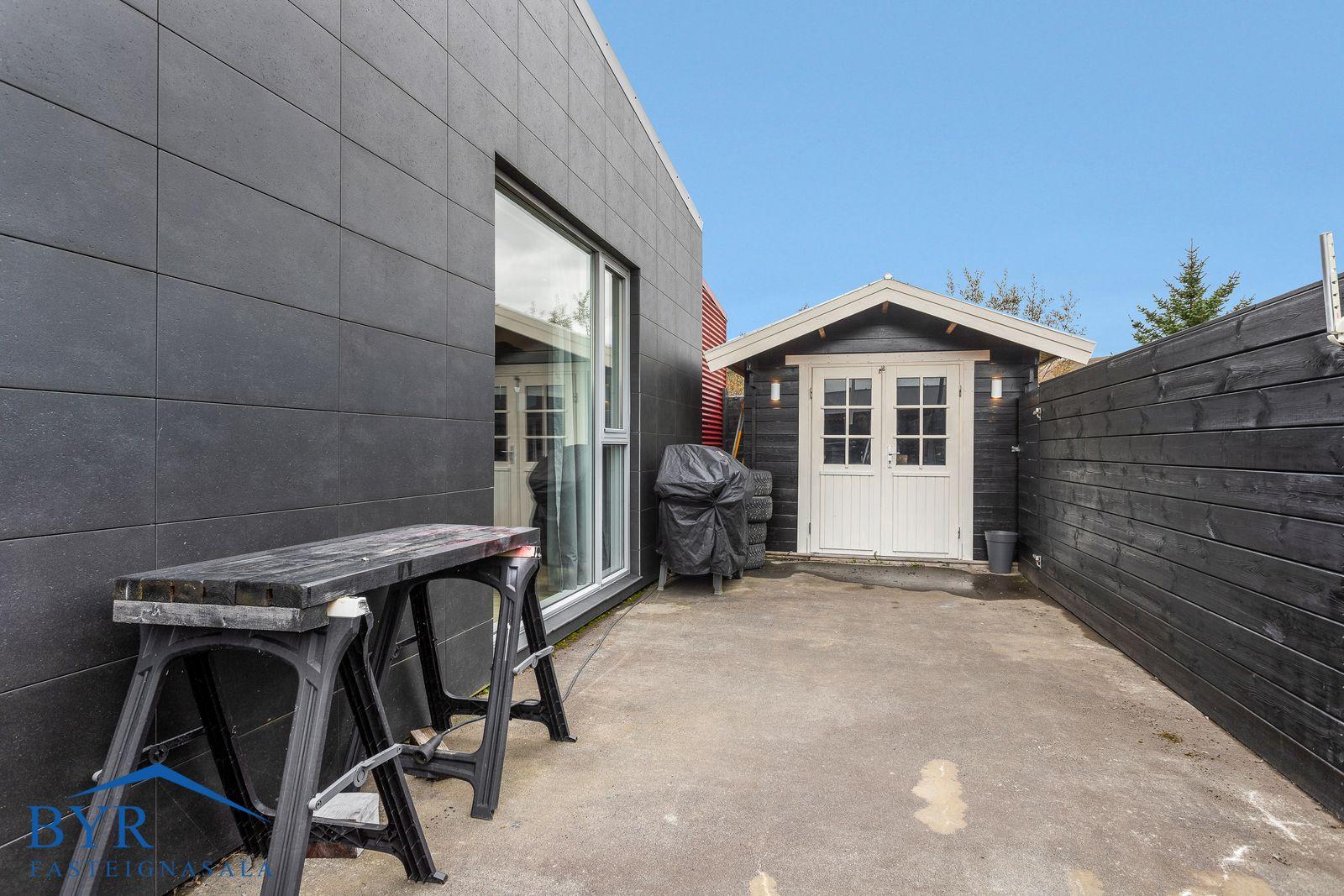 Geymsluskúr u.þ.b.8.4 m² stendur við verönd, fánastöng. Sorptunnuskýli fyrir tvær tunnur. Lóð aftan við húsið er grasi gróin.