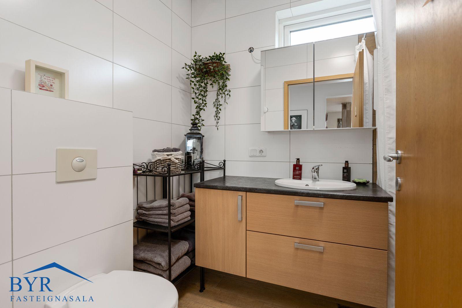 Gólfefni: Harðparket er á alrými, herbergjum, gangi og geymslu. Flísar eru á anddyri/gangi, baðherbergi og þvottahúsi.