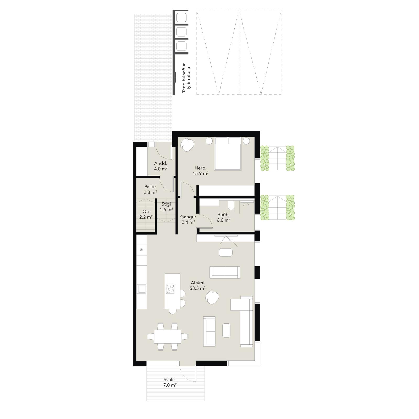 - 5 herbergja, 3-4 svefnherbergi, 2 stofur og 2 baðherbergi - Þak steypt með þreföldum bræddum dúk og torfi - Loftskiptikerfi og gólfhiti - Tvö einkabílastæði með snjóbræðslu - Möguleiki að gera aukaíbúð á neðri hæðinni - Lagt út lagnaleið fyrir heitum potti
