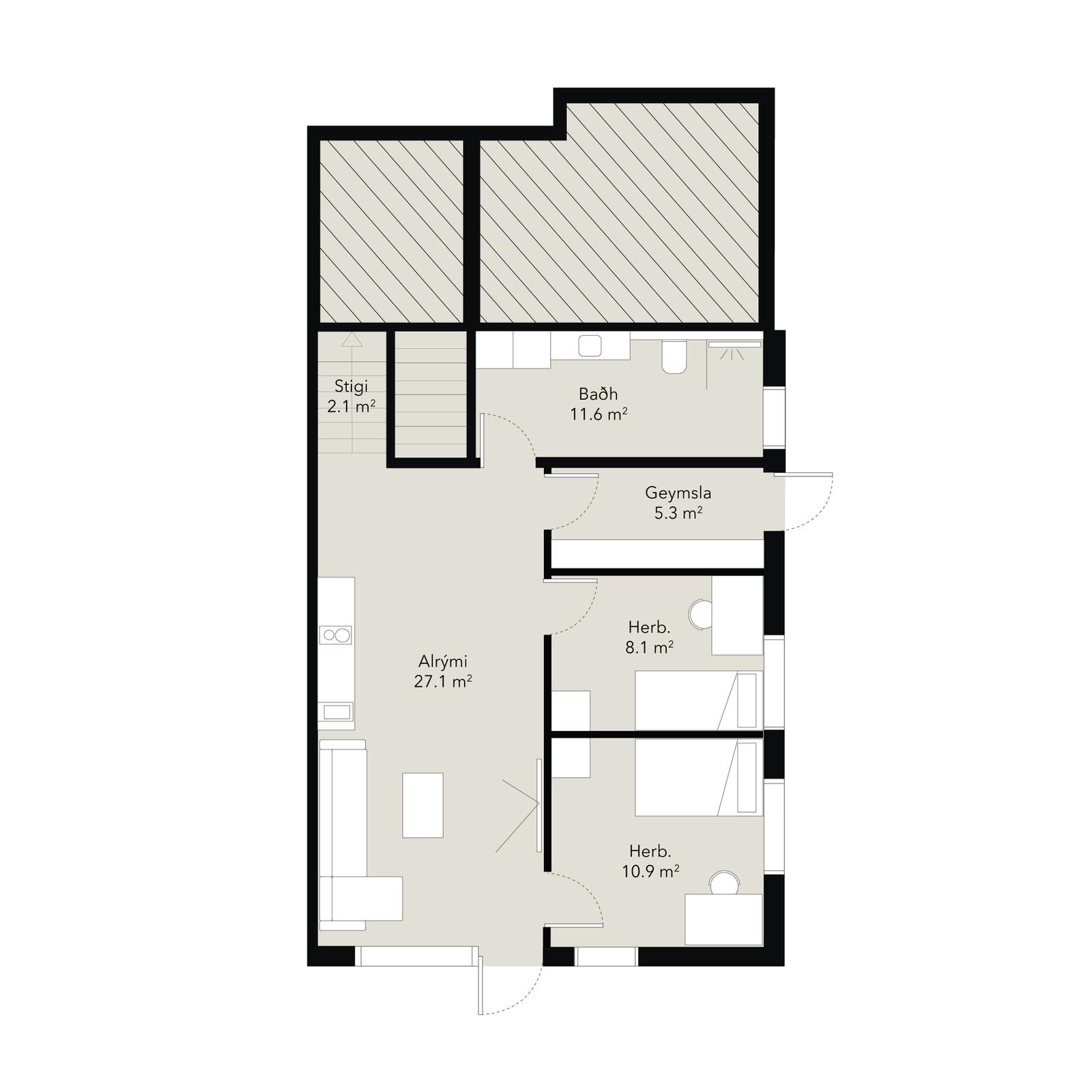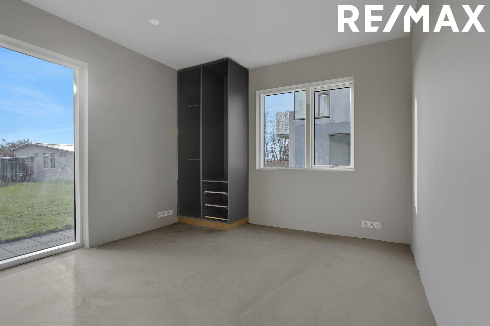 Neðri hæð: Tvö svefnherbergi með fataskápum. Stórt alrými með útgengt út í bakgarðinn. Hægt er að gera fjórða svefnherbergið úr hluta alrýmisins. Geymsla með hurð út í garð. Baðherbergi 2 er flísalagt í hólf og gólf. Upphengt klósett, innrétting, sturta, gluggi fyrir loftun og innrétting fyrir þvottavél og þurrkara.