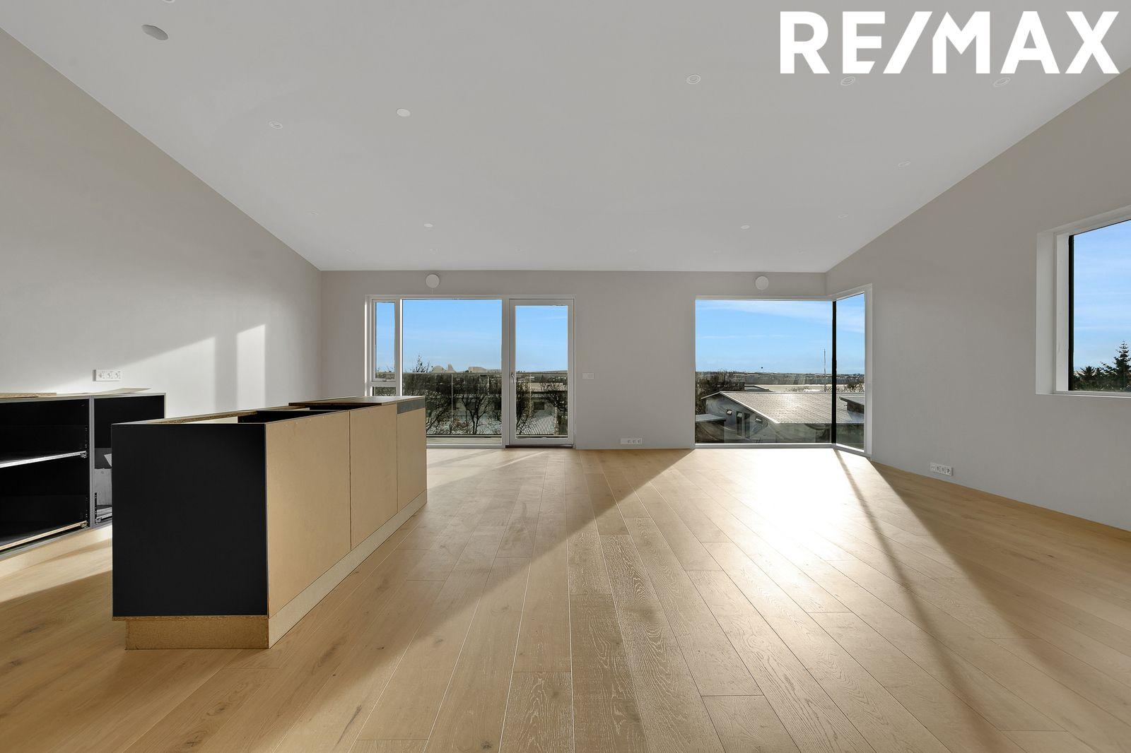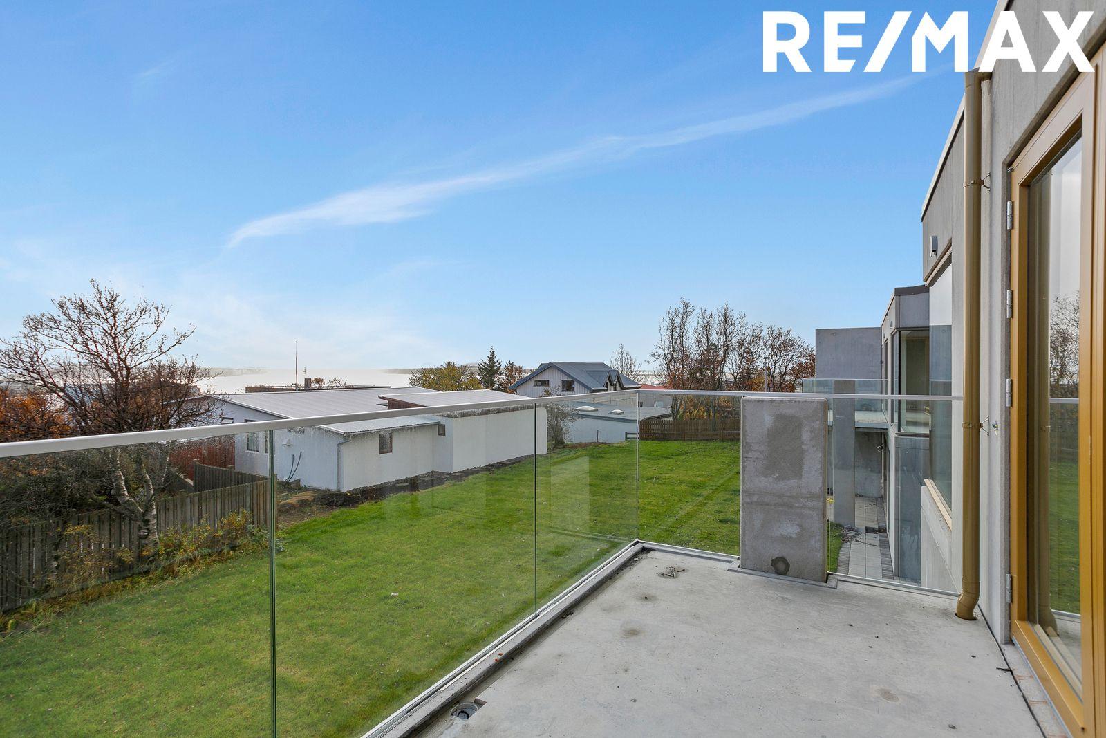 Efri hæð: Stofan og eldhúsið er í opnu alrými. Fallegt útsýni yfir byggð og til sjávar. Gólfsíður gluggi og horngluggi sem gefa eigninni mikinn sjarma (enginn gluggapóstur í horninu). Svalir eru með glerhandriði og snúa í suðurátt. Eldhúsið er með sérsmíðuðum innréttingum. Tveir bakaraofnar, helluborð, innbyggður ísskápur og uppþvottavél. Hjónaherbergið er með stórum fataskáp. Baðherbergi 1 er flísalagt í hólf og gólf. Upphengt klósett, innrétting, baðkar með sturtuaðstöðu og gluggi fyrir loftun.