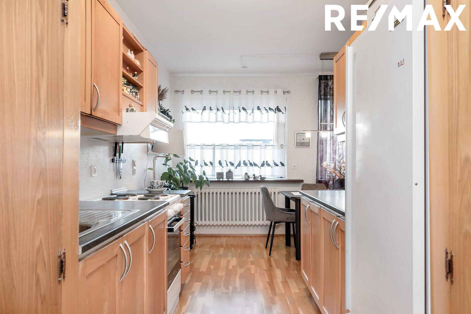Eldhúsið er rúmgott með góðu vinnuplássi, opið og samliggjandi með stofu, eldri innrétting, helluborð, parket á gólfi.