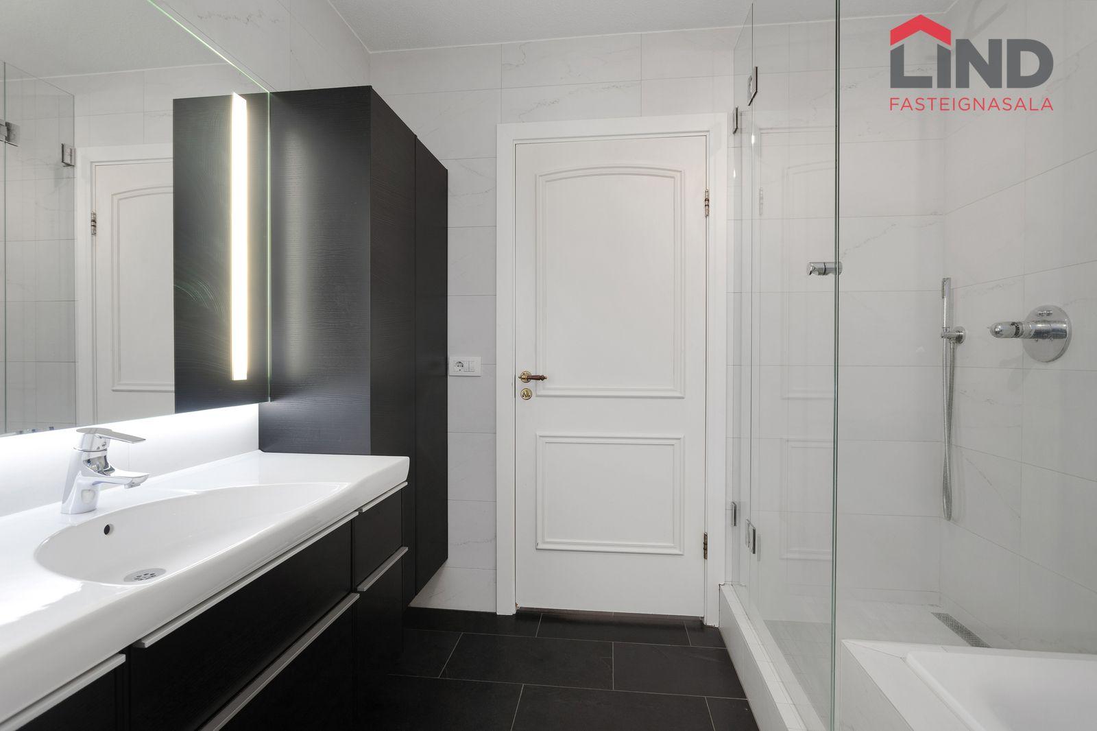 Baðherbergi: Er með náttúruflísum á gólfi og marmaraflísum á veggjum ásamt handklæðaofni. Svartri innréttingu og háum skápum með hvítum vaski, baðkari, sturtuklefa og upphengdu salerni. Hiti er í gólfi.
