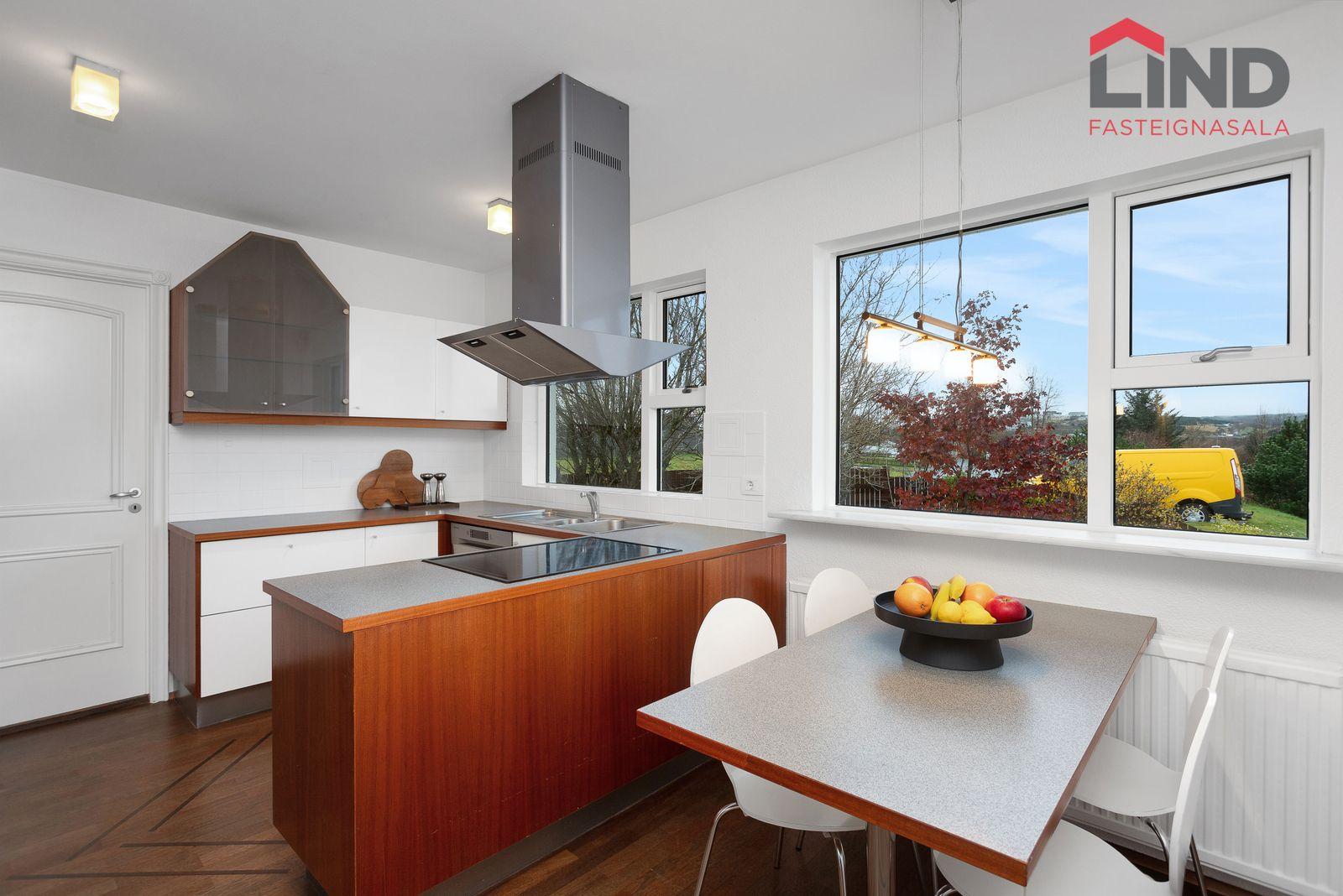 Eldhús: Er með parketlögðu gólfi og flísum á milli efri og neðri skápa, hvítri / mahogni innréttingu í U og grárri borðplötu ásamt háfi. Mikið skápapláss á vegg með bakaraofni í vinnuhæð og amerískum ísskáp. Borðkrókur með borði sem fylgir. Úr eldhúsi er gengið inn í þvottahús og þaðan í bílskúrinn.