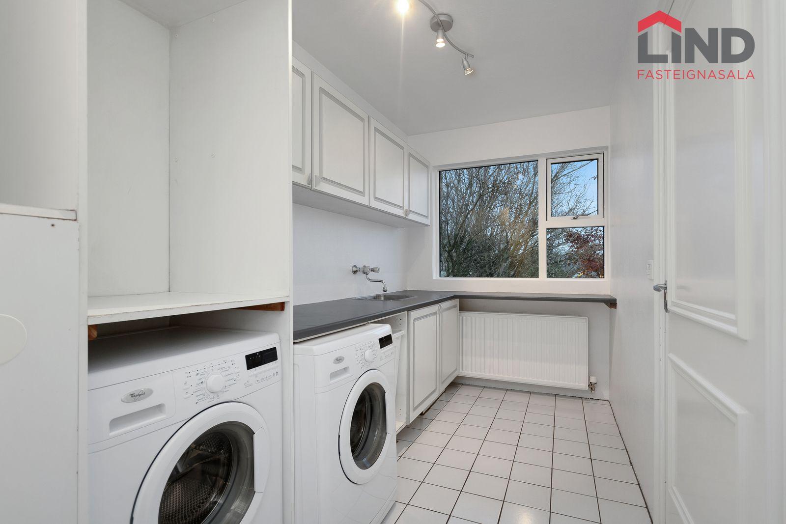 Þvottahús: Er með ljósum flísum á gólfi, hvítum efri og neðri skápum , grárri borðplötu, skolvaski og góðu vinnuplássi. Hægt er að vera með 2 þvottavélar og 1 þurrkara. Gengið er úr þvottahúsi beint inn í bílskúr.