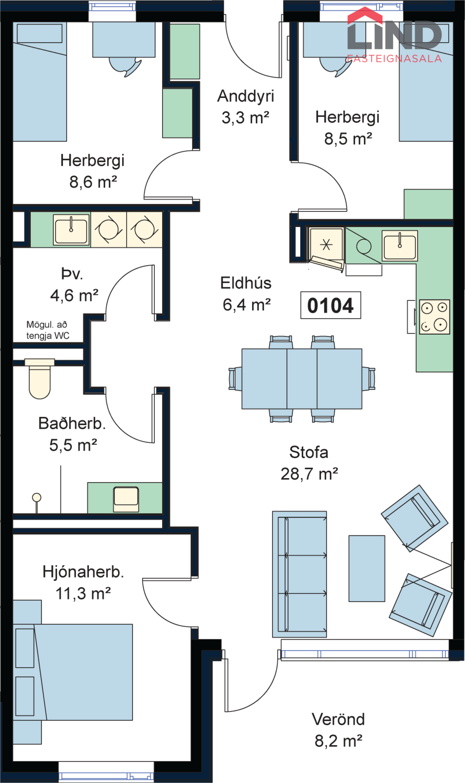 Íbúð 104 er 4 herbergja íbúð með sérinngang á jarðhæð með 8,2 fm. verönd, 4 fm geymslu og sér þvottahúsi.