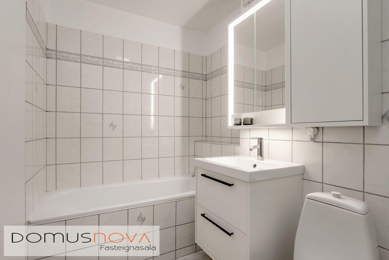 Baðherbergi – Baðherbergið er flísalagt ljósum flísum á gólfi og veggjum. Nýleg Ikea baðinnrétting frá 2025 með efri skápum og spegli með lýsingu við innréttingu, baðkar og sturta á baðherbergi.