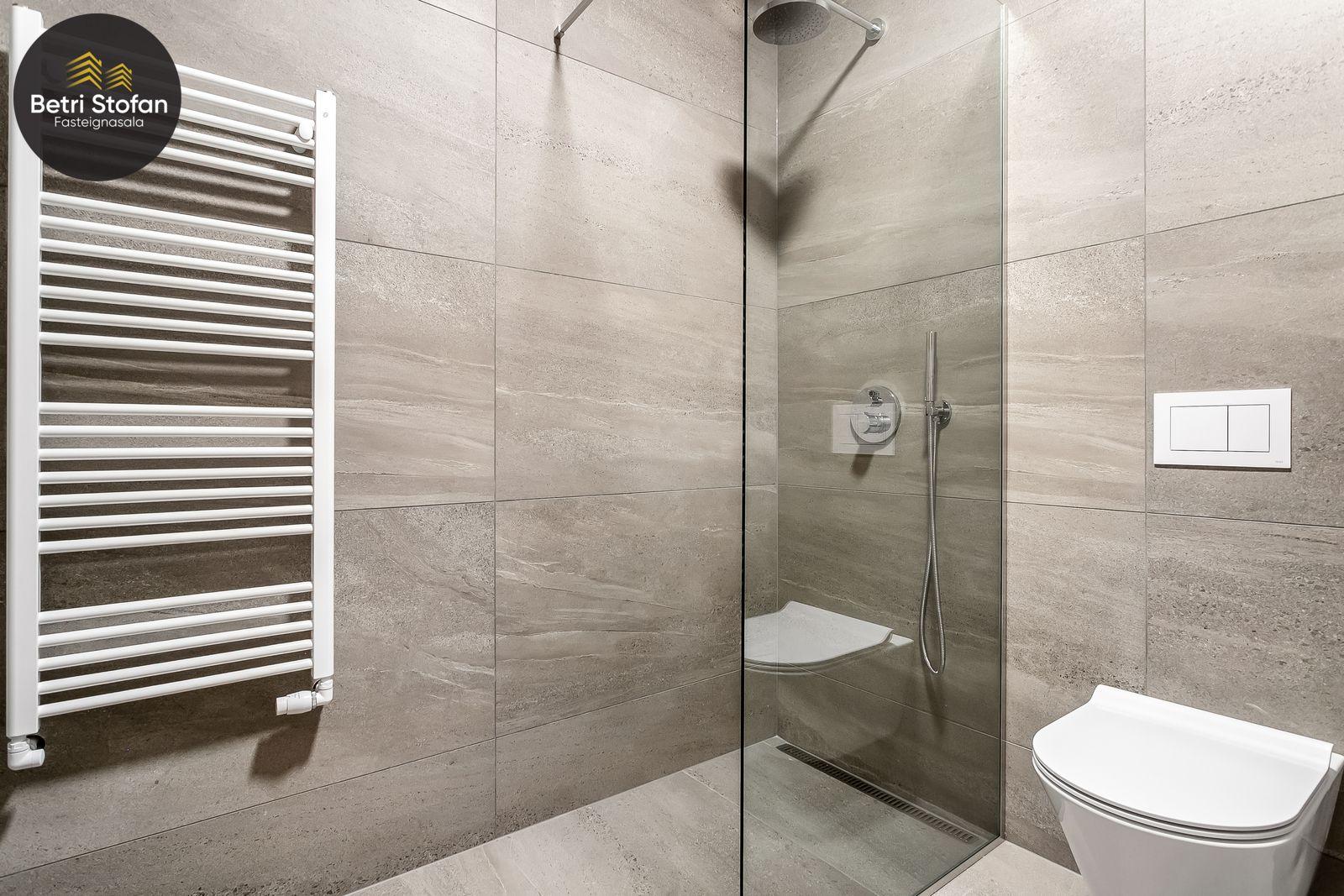 Baðherbergi með sturtu, innréttingu, handlaug, upphengdu salerni og handklæðaofn. Þvottaaðstaða inná baðherbergi.