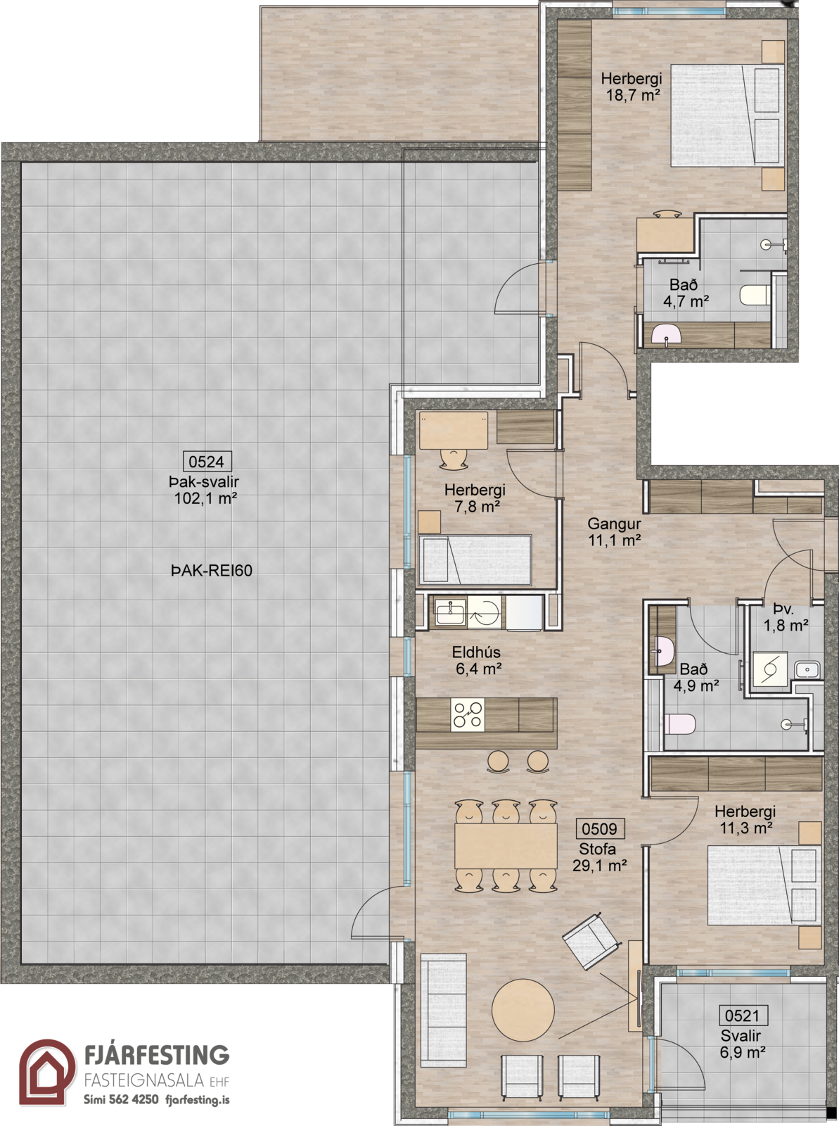 Íbúðin sjálf er 115,8 fm. Sérgeymsla í kjallara er 9,6 fm. Samtals er eignin því skráð 125,4 fm.