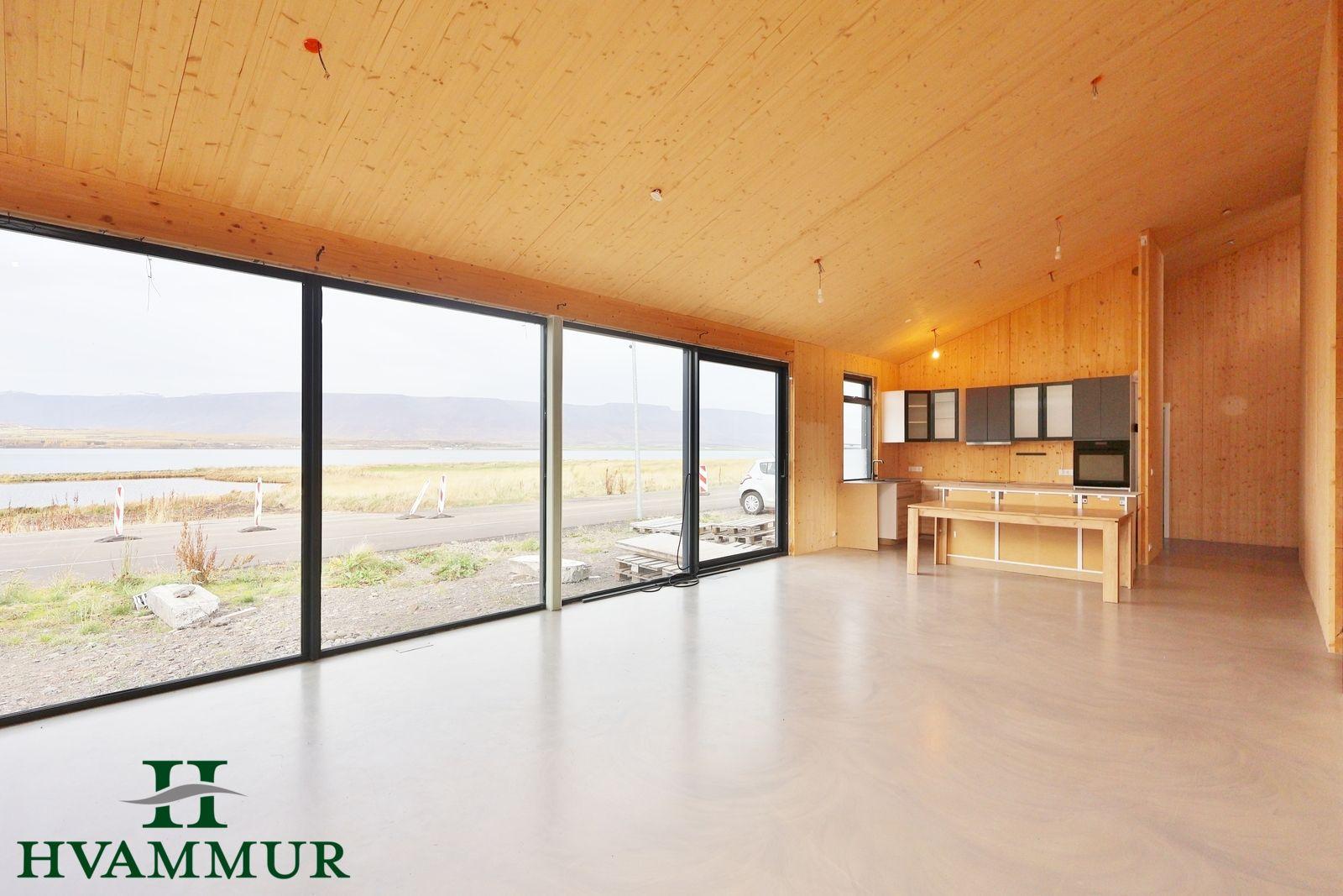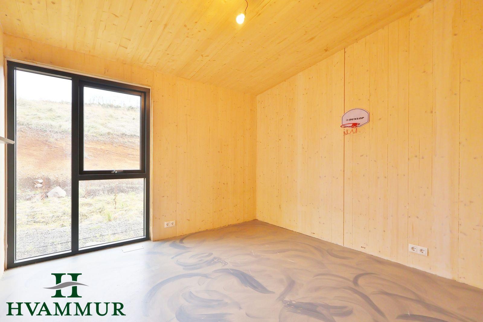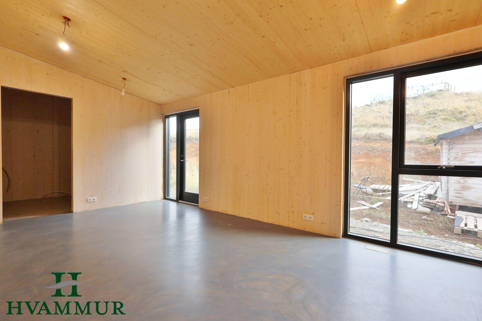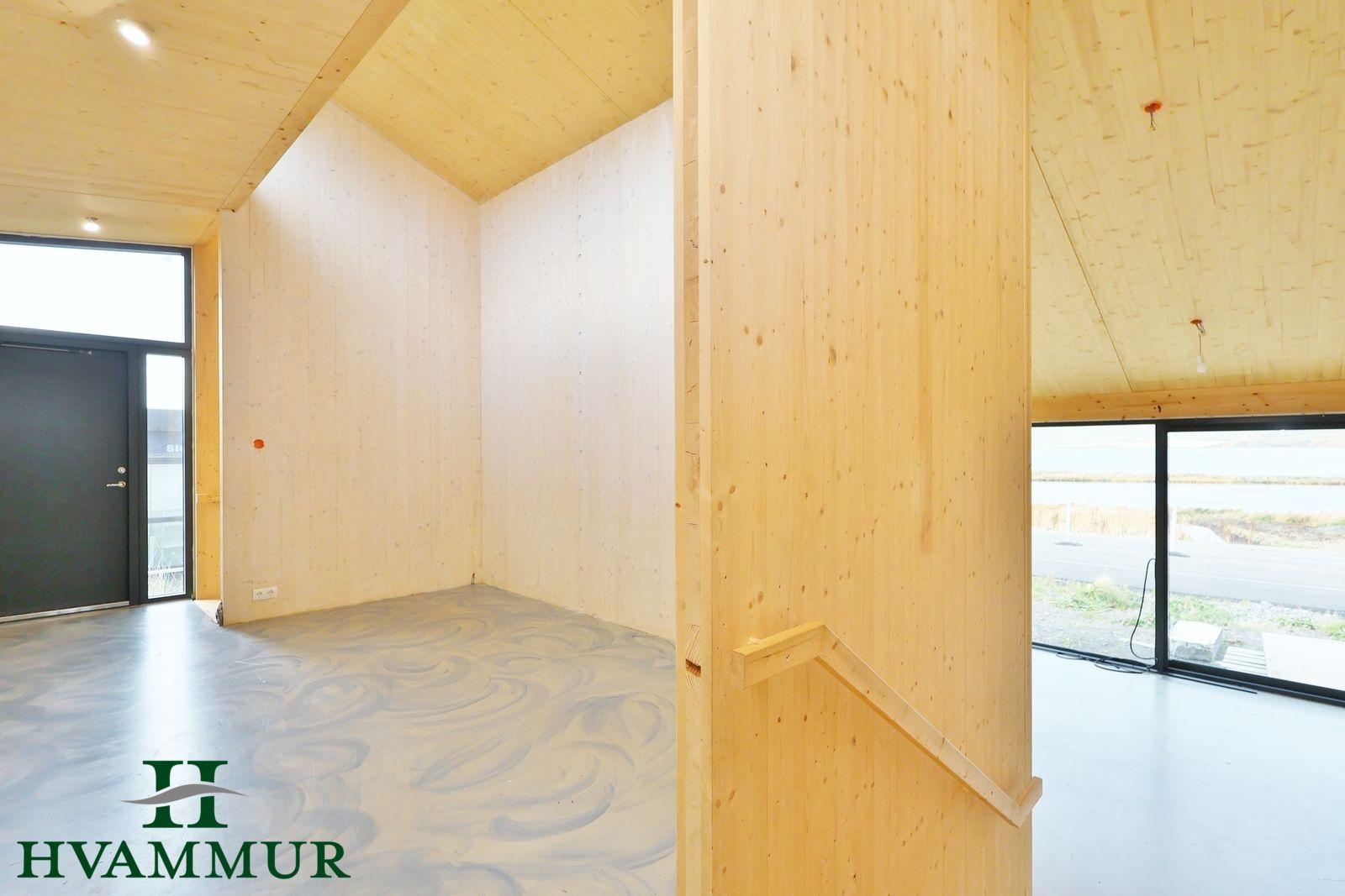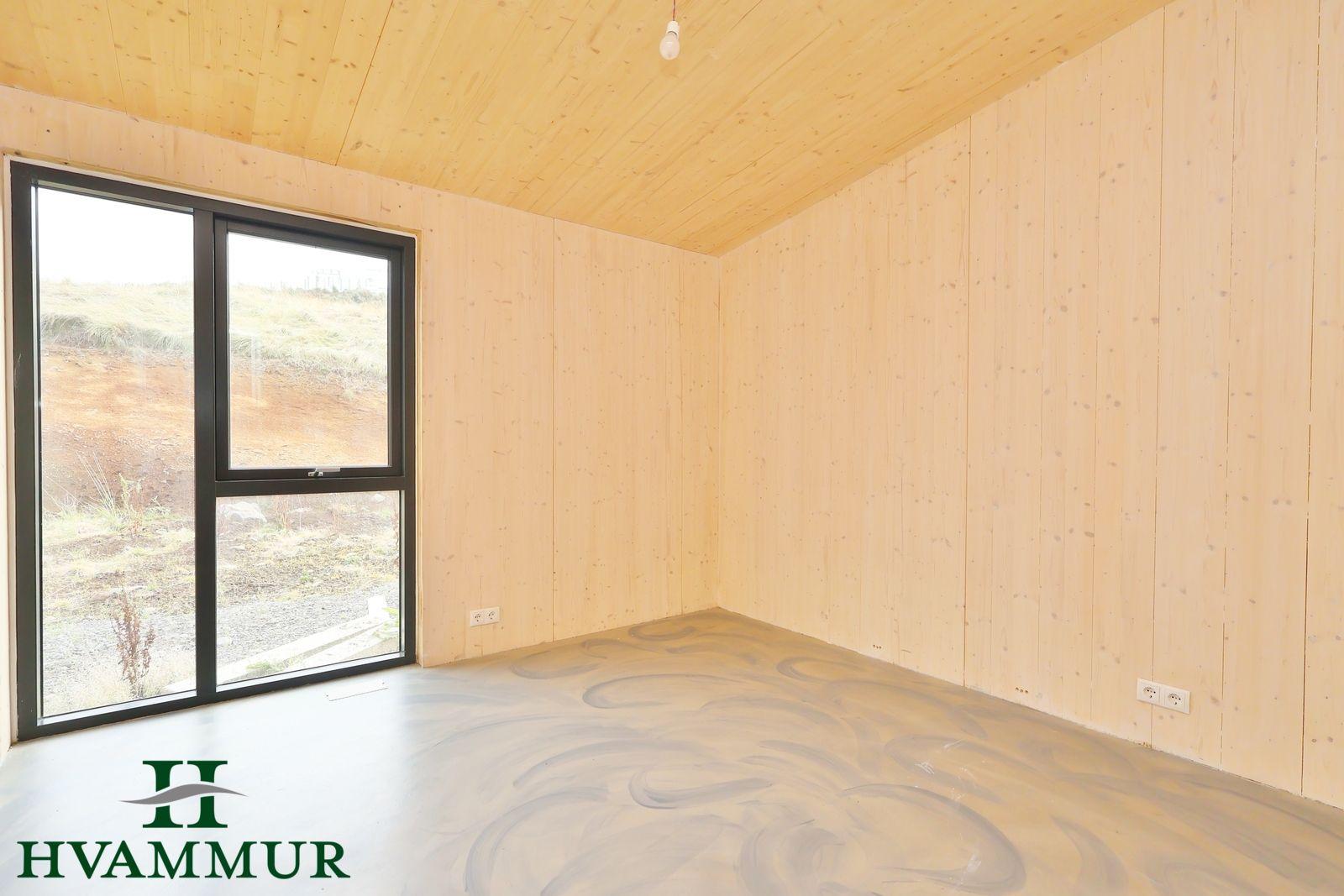 Alrýmið samanstendur af stofu og eldhúsi oger mjög rúmgott og með mikilli lofthæð - útgangur er úr stofu til vesturs út á lóð. Í eldhúsi er ókláruð innrétting frá IKEA og á hana vantar borðplötu. Sjónvarpsstofa er á efri palli og þar er aukin lofthæð. Svefnherbergin eru fjögur talsins í þeim öllum eru gólfsíðir gluggar og í einu þeirra útgangur til austurs út á lóð. Baðherbergið er með flísum á gólfi og á veggjum eru fibo-trespo plötur að hluta. Rúmgóð walk-in sturta og opnanlegur gluggi (sem þó er mjög hátt uppi). Gert er ráð fyrir öðru baðherbergi innaf hjónaherbergi og salerni við forstofu, en ekki er búið að setja þau upp. Bílskúrinn er rúmgóður eða um 43 m² að stærð og inní hann er farið um þvottahús sem er á milli forstofu og bílskúrs. Aukin lofthæð er í bílskúr og auðvelt að útbúa aukið geymslupláss/geymsluloft.