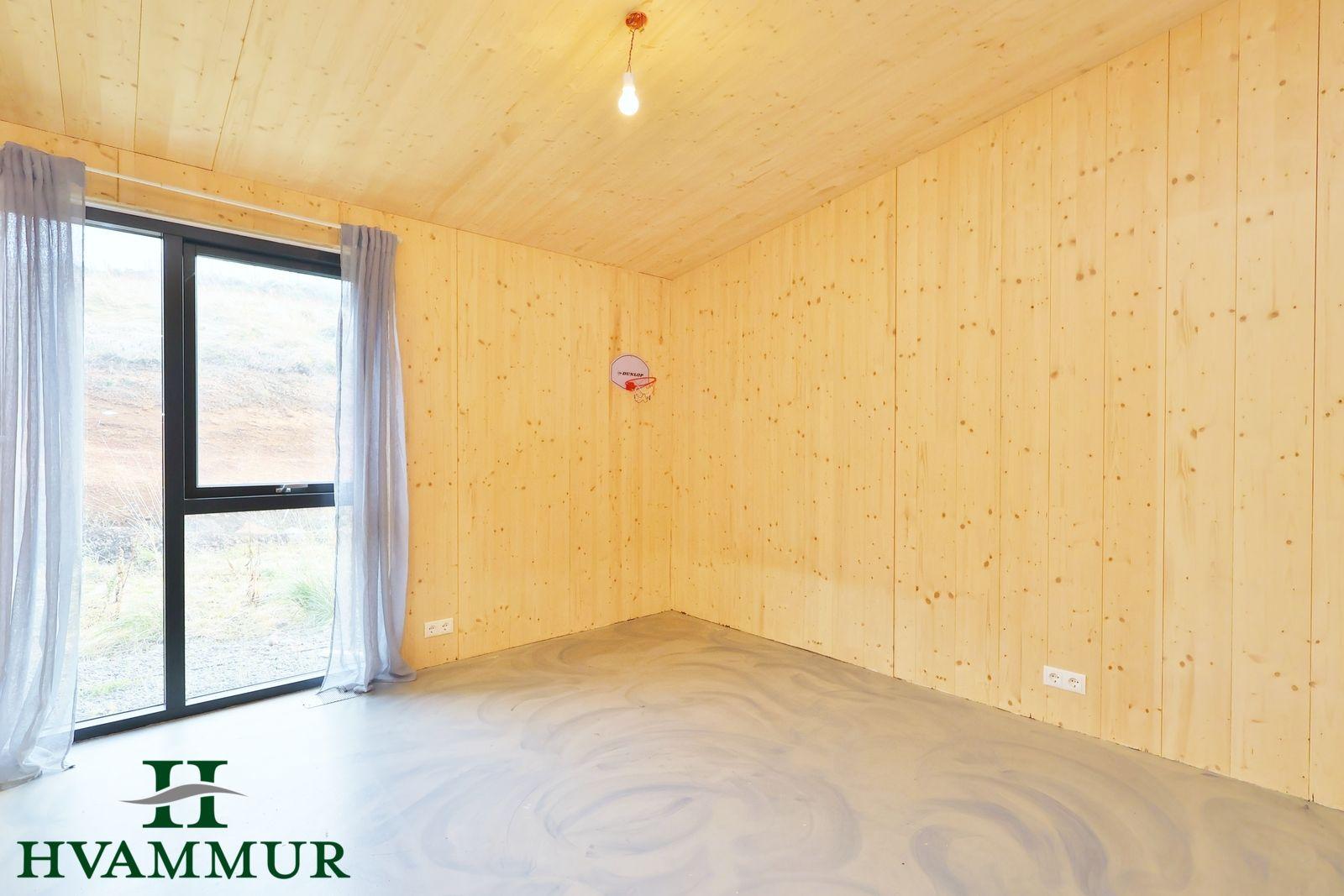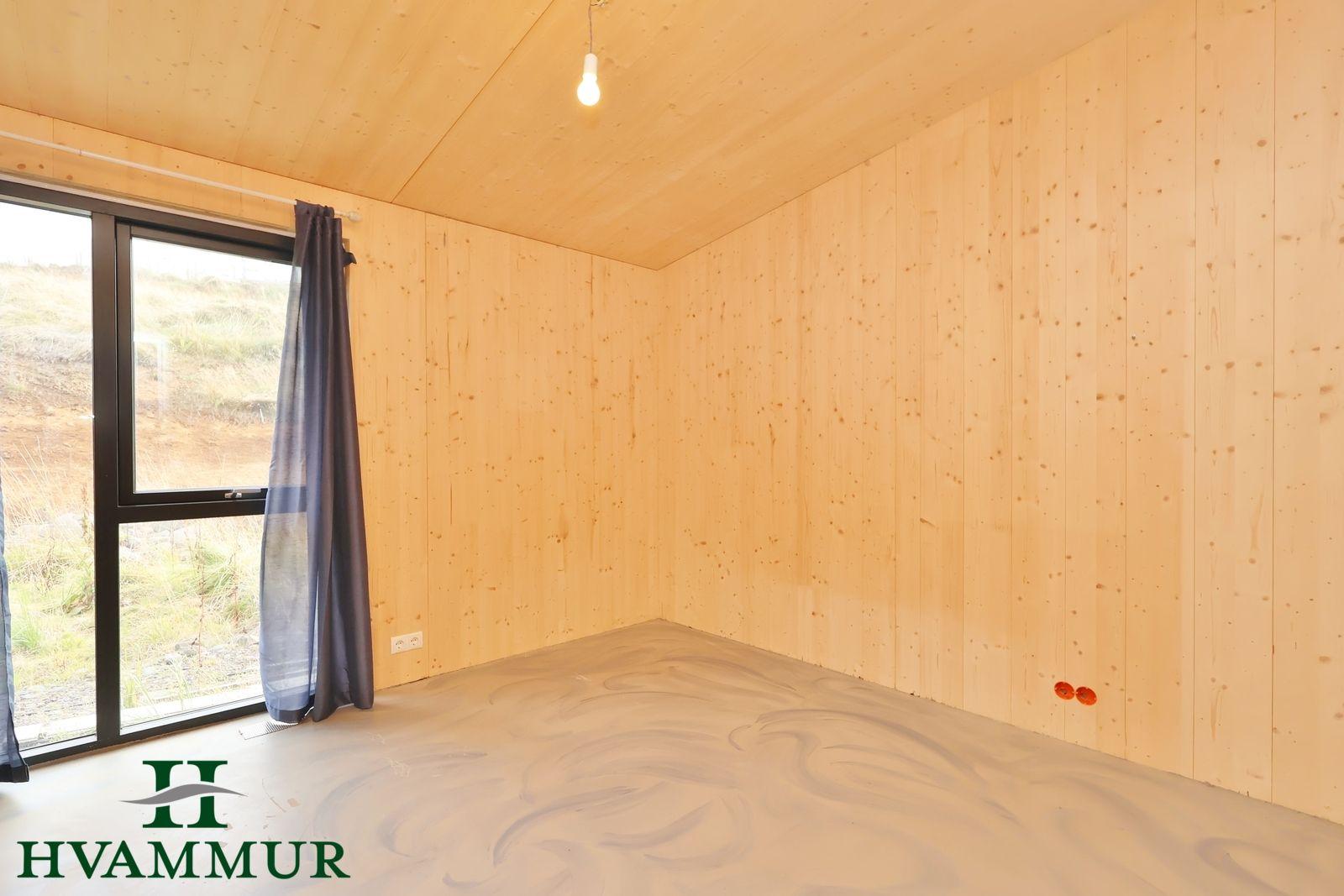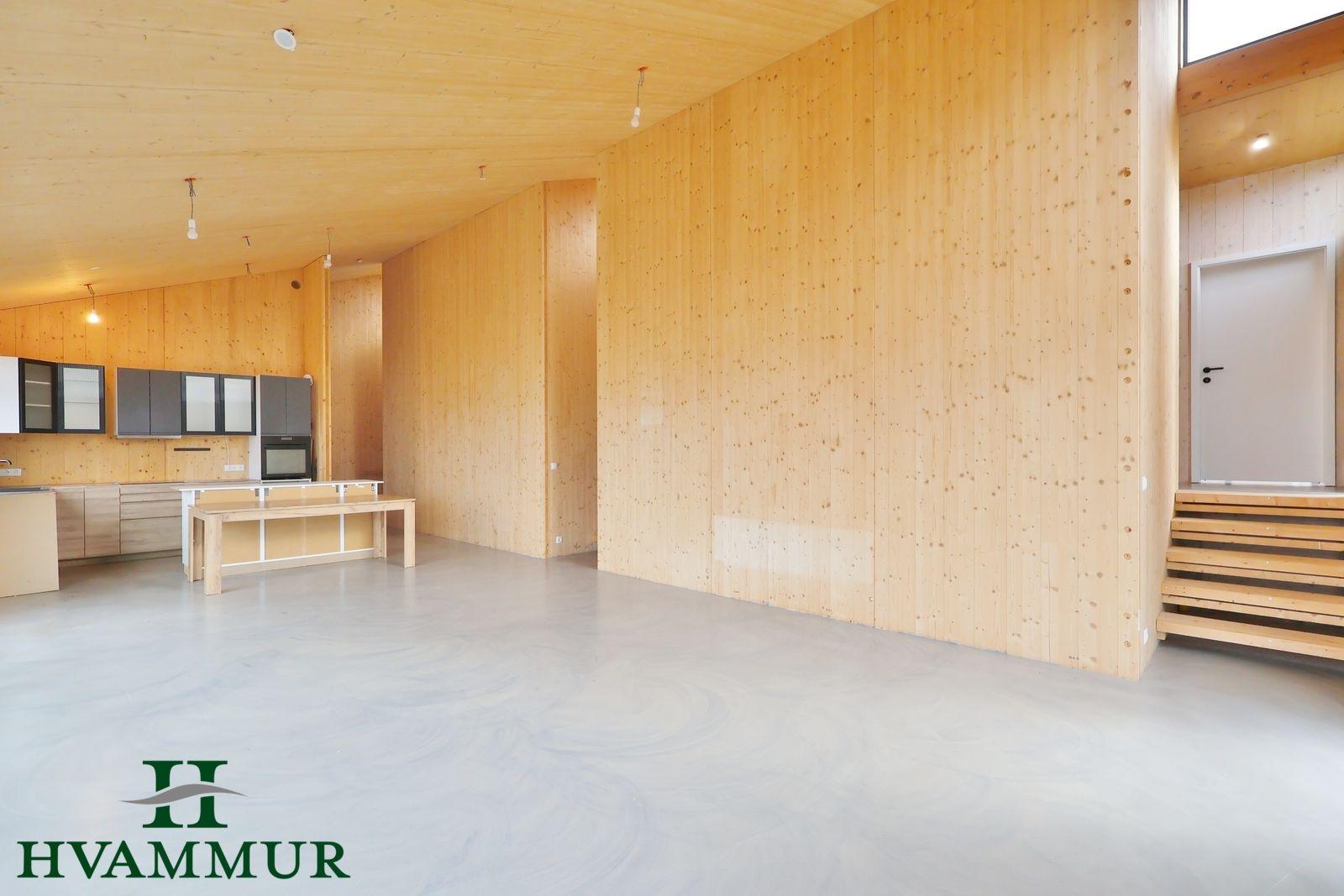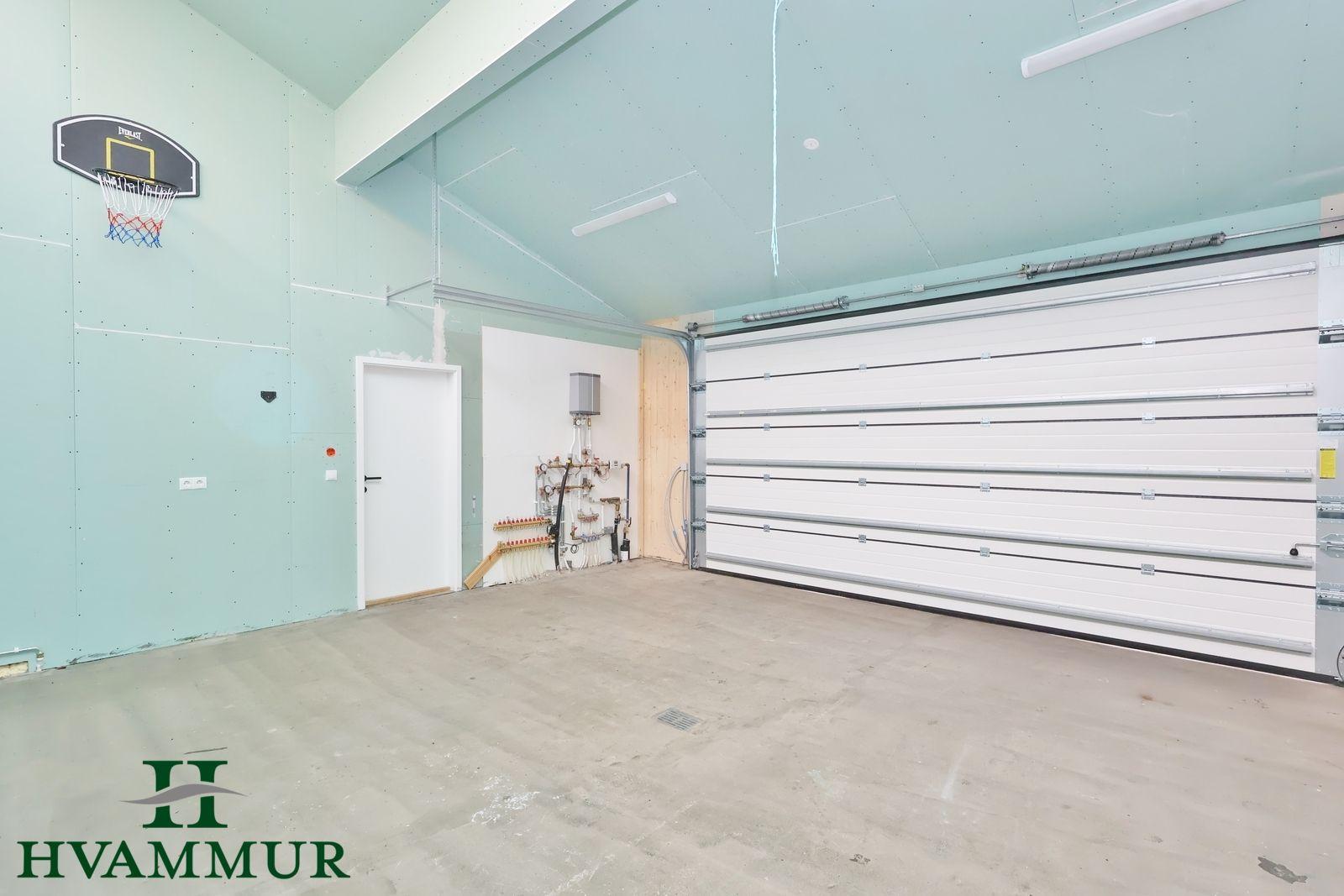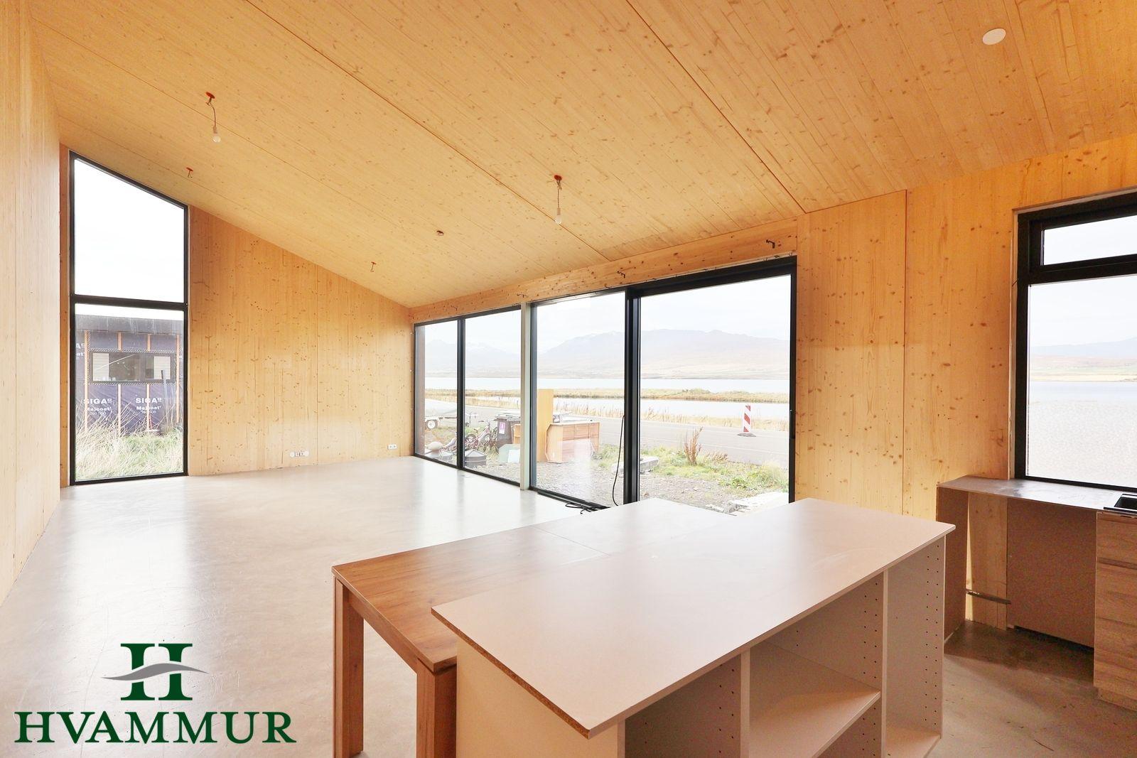 Alrýmið samanstendur af stofu og eldhúsi oger mjög rúmgott og með mikilli lofthæð - útgangur er úr stofu til vesturs út á lóð. Í eldhúsi er ókláruð innrétting frá IKEA og á hana vantar borðplötu. Sjónvarpsstofa er á efri palli og þar er aukin lofthæð. Svefnherbergin eru fjögur talsins í þeim öllum eru gólfsíðir gluggar og í einu þeirra útgangur til austurs út á lóð. Baðherbergið er með flísum á gólfi og á veggjum eru fibo-trespo plötur að hluta. Rúmgóð walk-in sturta og opnanlegur gluggi (sem þó er mjög hátt uppi). Gert er ráð fyrir öðru baðherbergi innaf hjónaherbergi og salerni við forstofu, en ekki er búið að setja þau upp. Bílskúrinn er rúmgóður eða um 43 m² að stærð og inní hann er farið um þvottahús sem er á milli forstofu og bílskúrs. Aukin lofthæð er í bílskúr og auðvelt að útbúa aukið geymslupláss/geymsluloft.