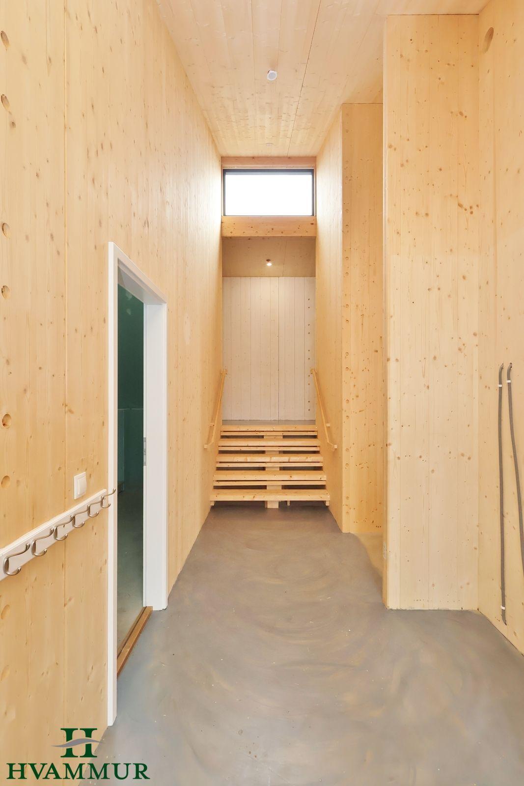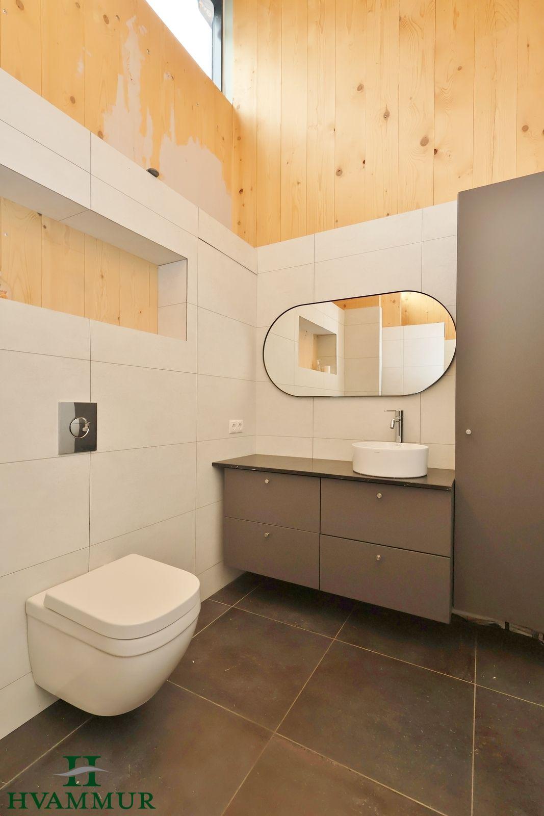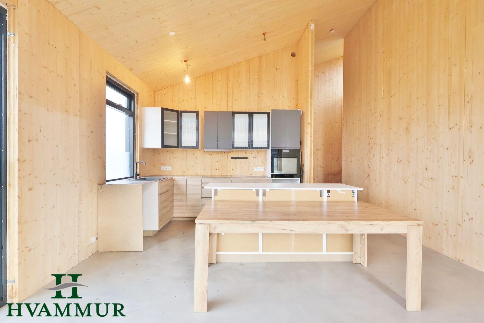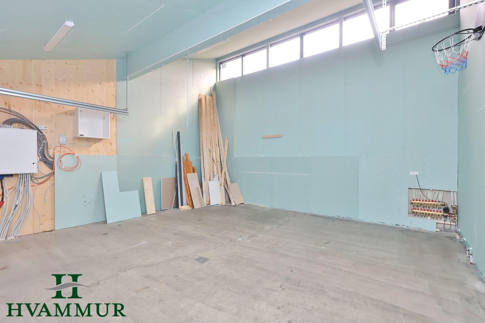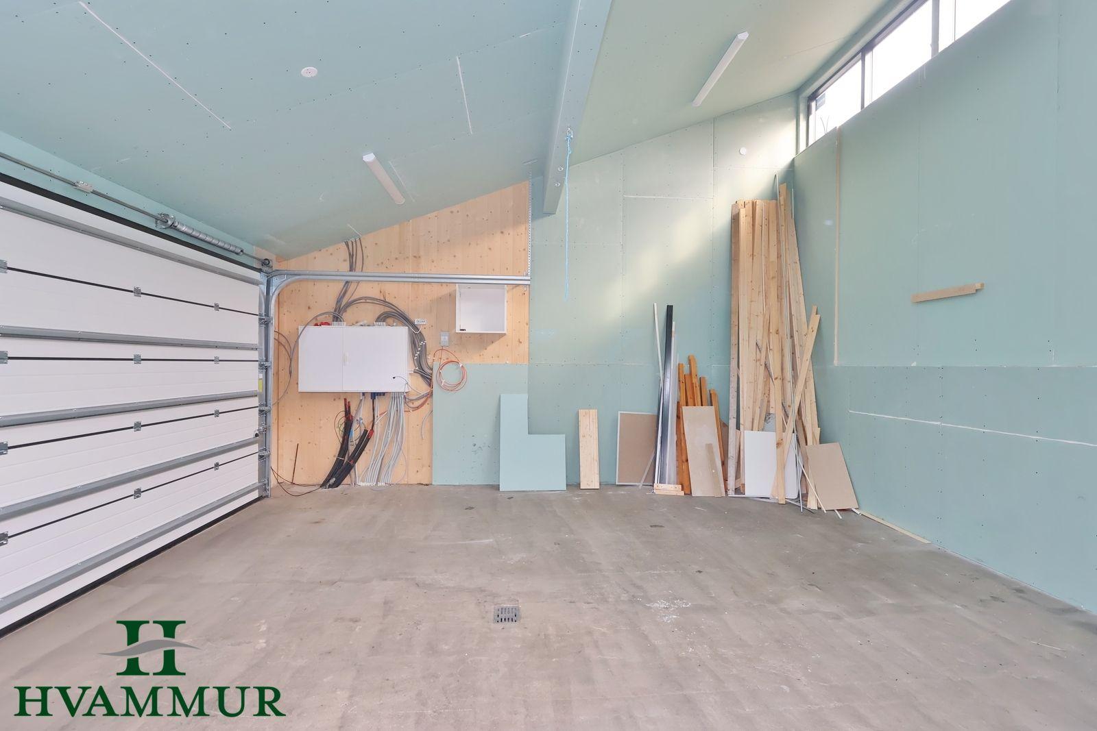 Alrýmið samanstendur af stofu og eldhúsi oger mjög rúmgott og með mikilli lofthæð - útgangur er úr stofu til vesturs út á lóð. Í eldhúsi er ókláruð innrétting frá IKEA og á hana vantar borðplötu. Sjónvarpsstofa er á efri palli og þar er aukin lofthæð. Svefnherbergin eru fjögur talsins í þeim öllum eru gólfsíðir gluggar og í einu þeirra útgangur til austurs út á lóð. Baðherbergið er með flísum á gólfi og á veggjum eru fibo-trespo plötur að hluta. Rúmgóð walk-in sturta og opnanlegur gluggi (sem þó er mjög hátt uppi). Gert er ráð fyrir öðru baðherbergi innaf hjónaherbergi og salerni við forstofu, en ekki er búið að setja þau upp. Bílskúrinn er rúmgóður eða um 43 m² að stærð og inní hann er farið um þvottahús sem er á milli forstofu og bílskúrs. Aukin lofthæð er í bílskúr og auðvelt að útbúa aukið geymslupláss/geymsluloft.