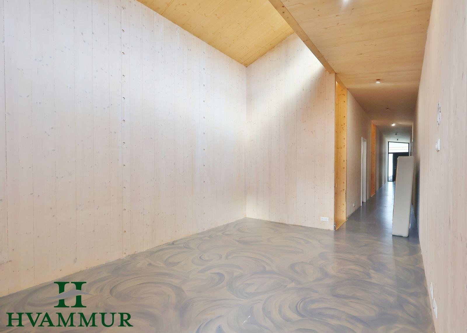 Allir veggir í íbúðarrými eru án klæðningar eða málningar, aðeins berar timbureiningar sem setur ákveðinn svip á eignina. Í þvottahúsi og bílskúr er búið að klæða með gipsi að stærstum hluta en þar á eftir að mála og sparsla. Raflagnir eru ekki fullkláraðar og bráðabirgða lýsing er í loftum að stærstum hluta.