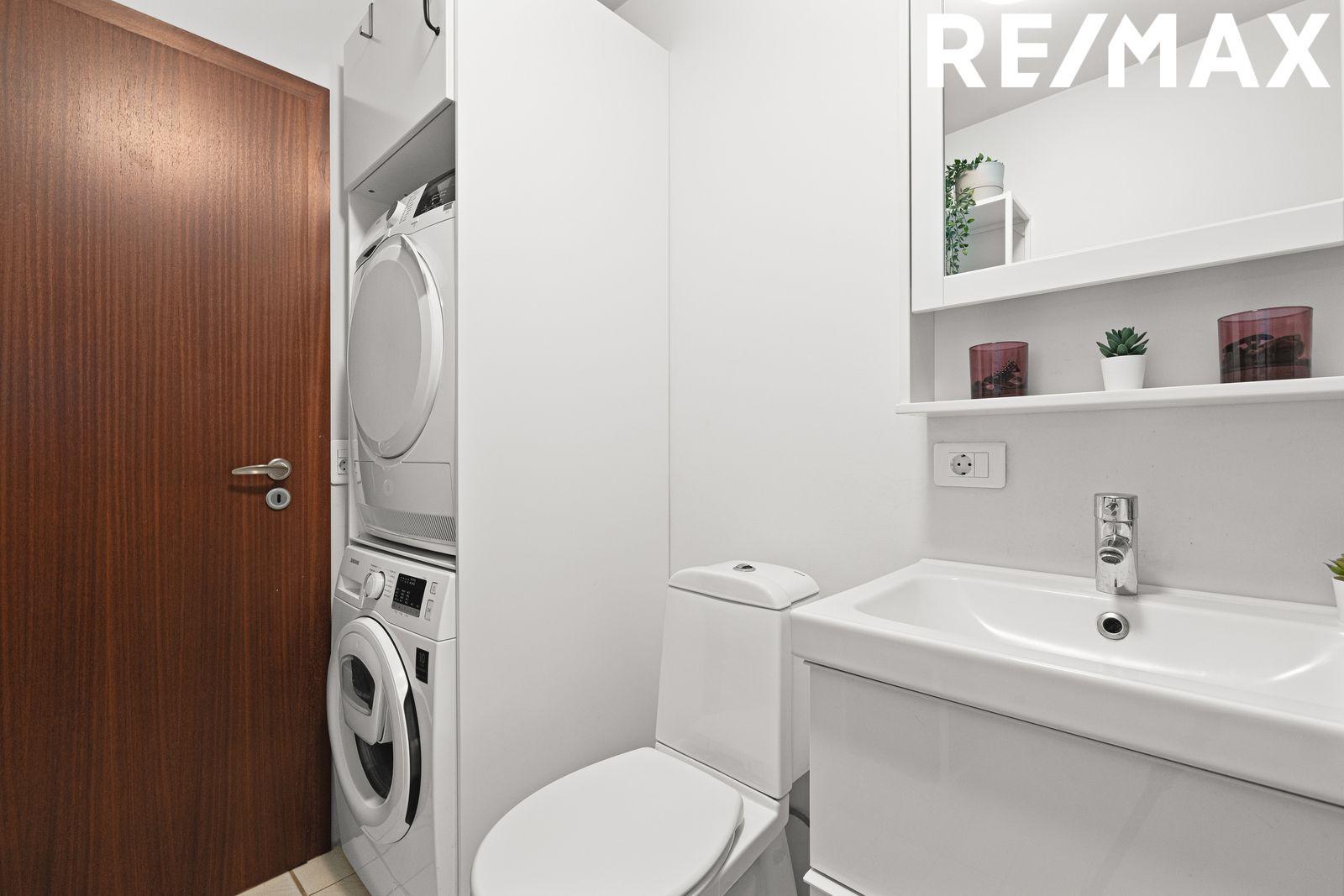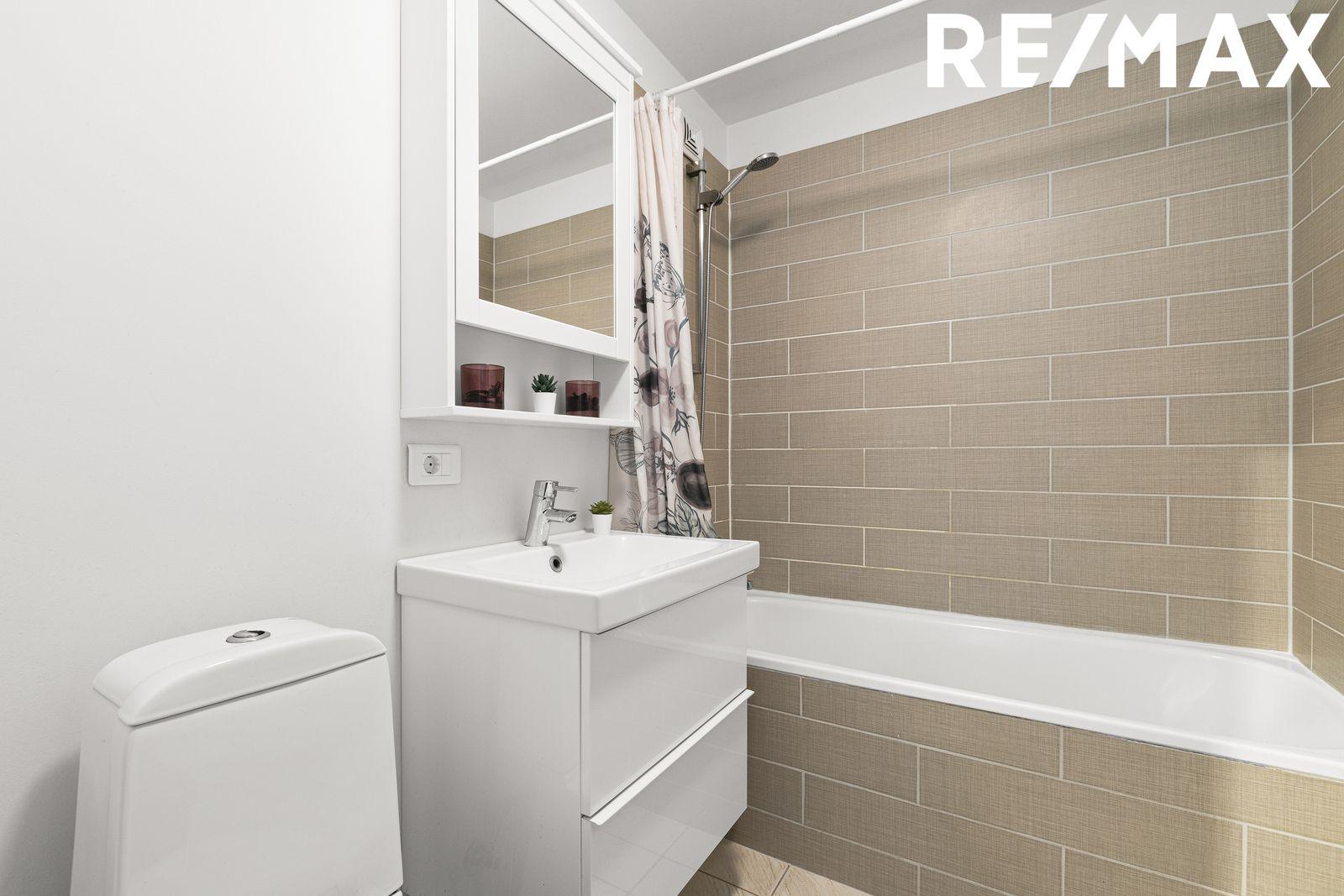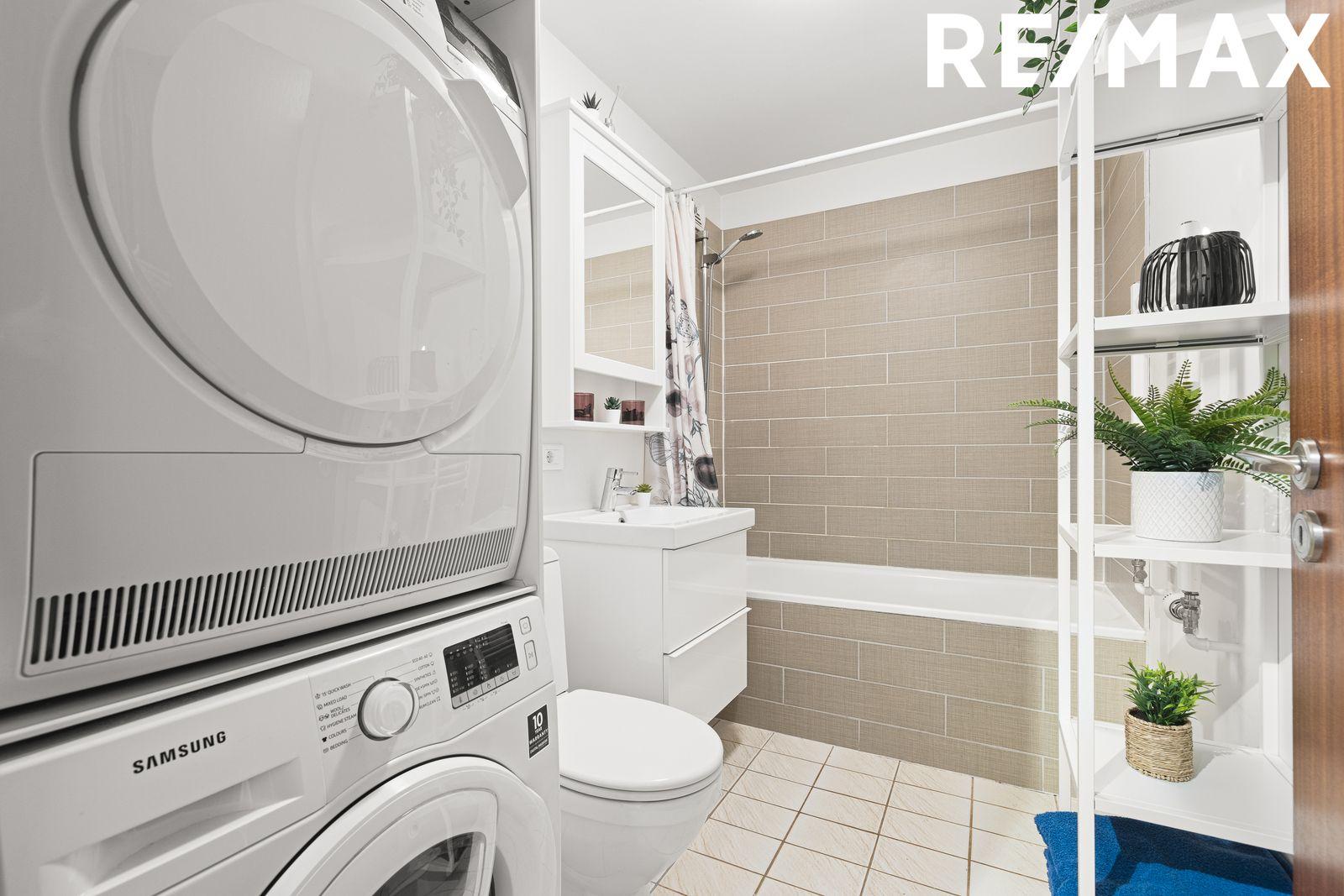 Baðherbergi: Flísar á votsvæði, aðrir veggir málaðir. Baðkar með sturtuaðstöðu, gólffest salerni,  hvít skúffuinnrétting með ljúflokum undir handlaug og speglaskápur á vegg, Innrétting fyrir þvottavél og þurrkara ásamt tengi fyrir tækin.