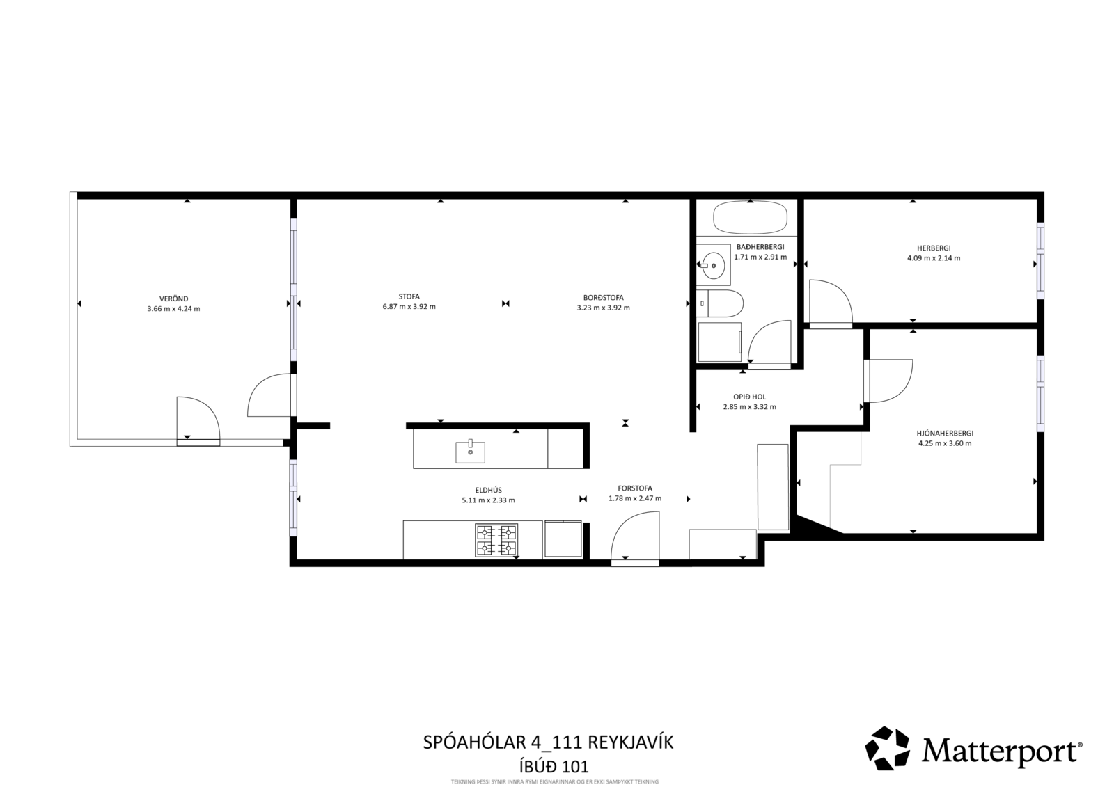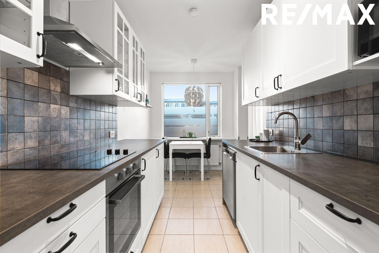 Eldhúsið Hvít innrétting með efri og neðri skápum. Borðplata er dökkgrá og eru veggflísar í stíl á milli efri og neðri skápa. Tengi fyrir uppþvottavél. span helluborð, veggháfur, bakaraofn undir borðplötu,  rúmgóður borðkrókur við gluggann. Rúllugardína.
