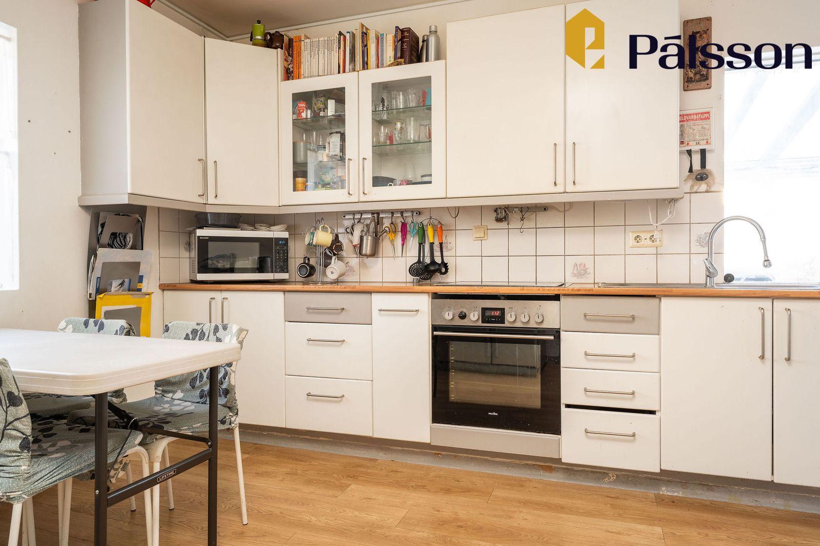 Eldhús: Tvö eldhús eru í húsinu, annað stærra með hvítum innréttingum og það minna með viðarlitum innréttingum. bæði rúmgóð og með góðu skápaplássi.