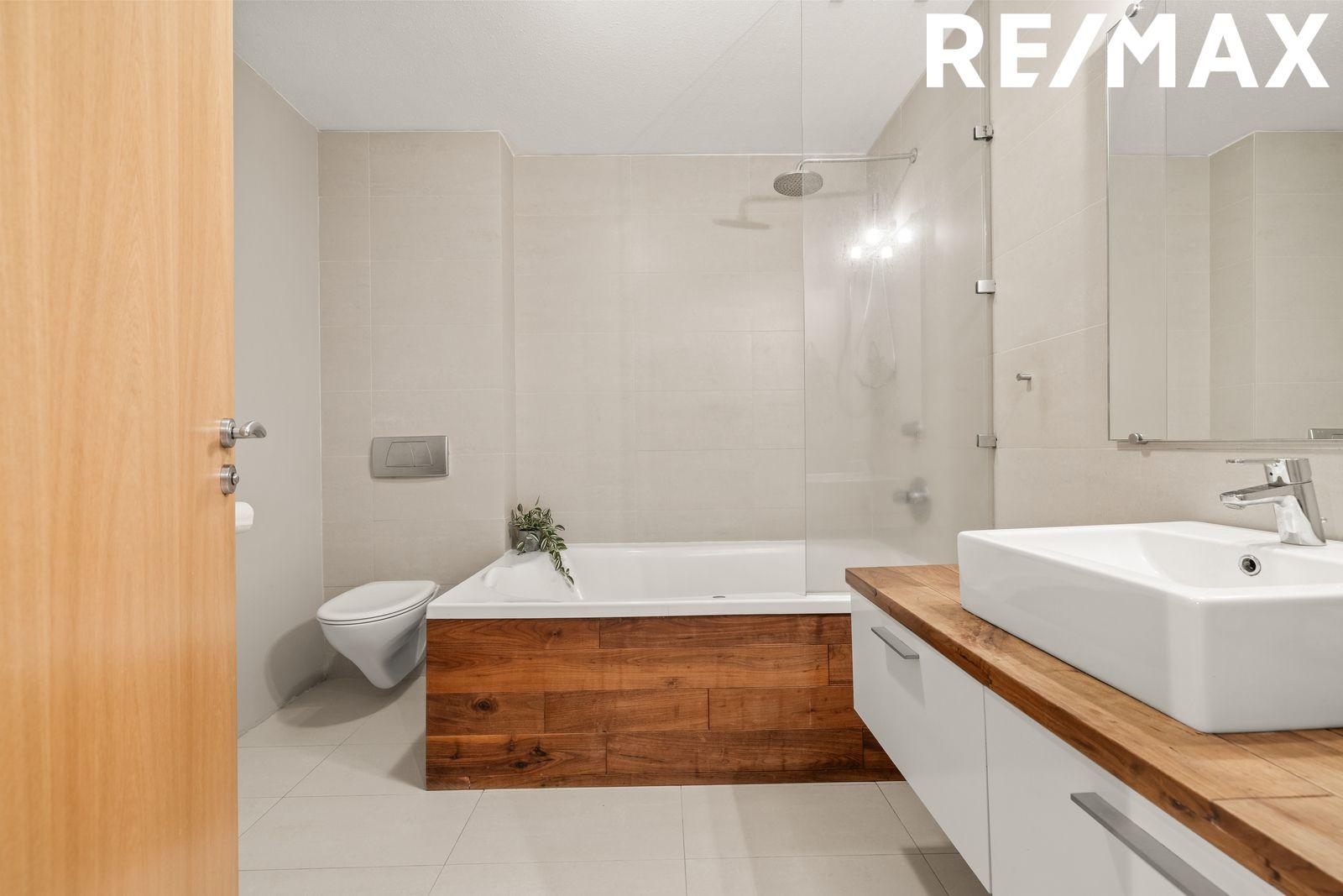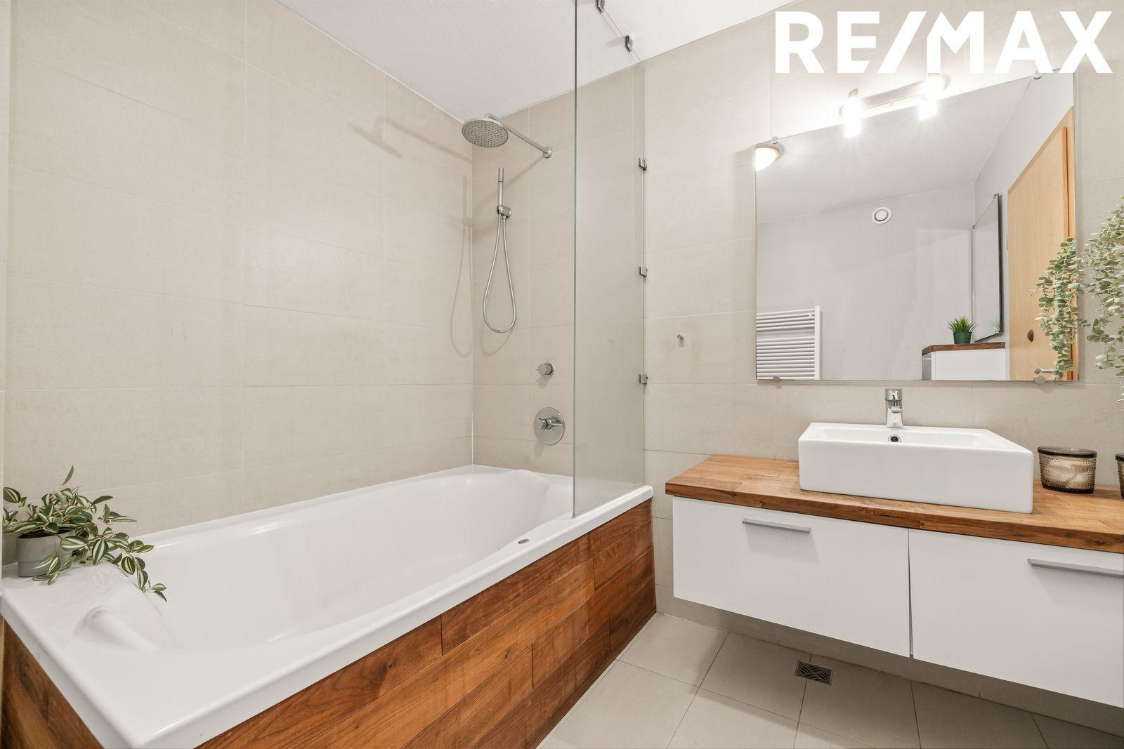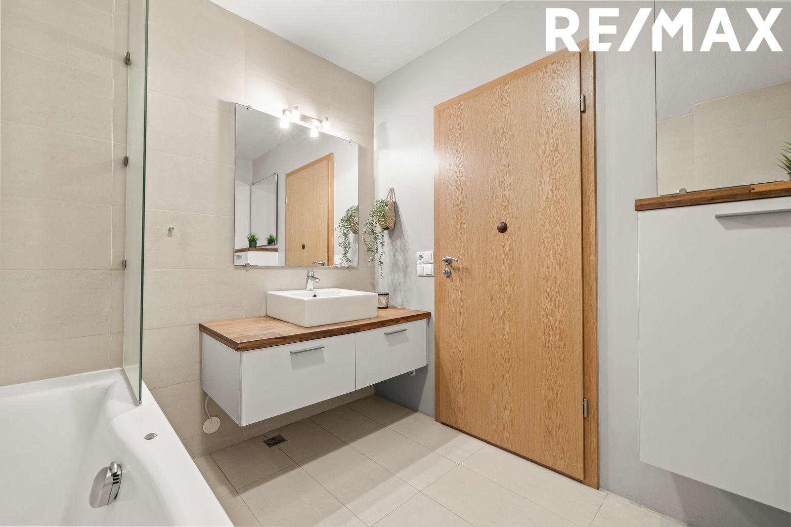 Baðherbergi er flísalagt í hólf og gólf með ljósum flísum. Hvít innrétting undir handlaug með viðarborðplötu. Stakur veggfestur skápur og veggfestir speglar. Baðkar með sturtugleri, hvítur handklæðaofn og upphengt salerni. Gólfhitastýring.