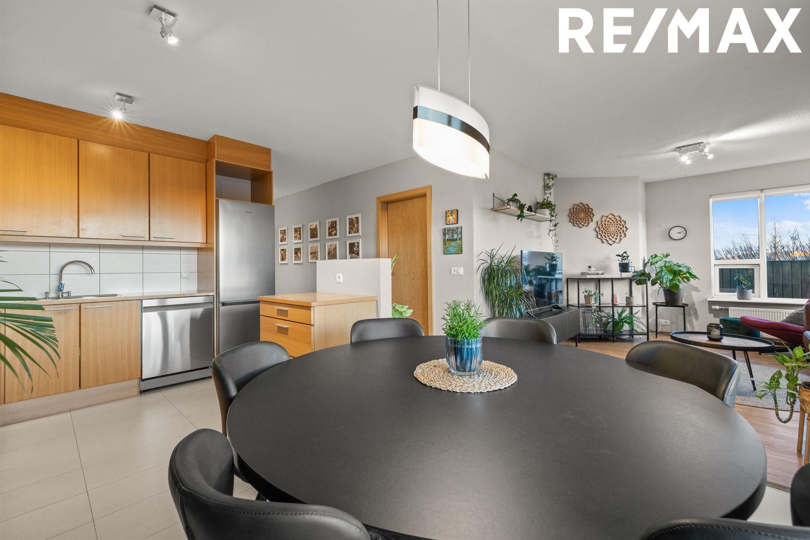 Eldhús og borðstofa eru í opnu rými með stofu. Innrétting er "L" laga og með auka sér einingu við stuttan léttan vegg. Efri skápar ná upp í loft. Skúffur eru einnig í sökkli innréttingar og stæði er fyrir ísskáp og uppþvottavél í innréttingu. Háfur kemur úr lofti yfir helluborði. Ljósar gólfflísar. Út frá borðstofu er gengið út á sér afnotareit.