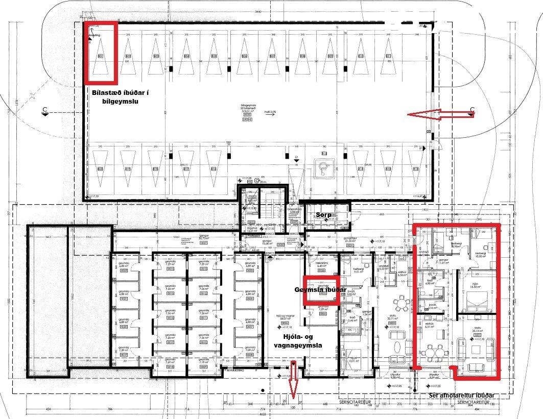 Bílgeymsla er lokuð og með 20 stæðum (jafn mörg og íbúðirnar). Stæðið sem fylgir þessari íbúð er einstaklega rúmgott, merkt B01. Rafmagnshleðsla er í stæðinu. Heimilt er að þrífa bíla í bílgeymslu.
