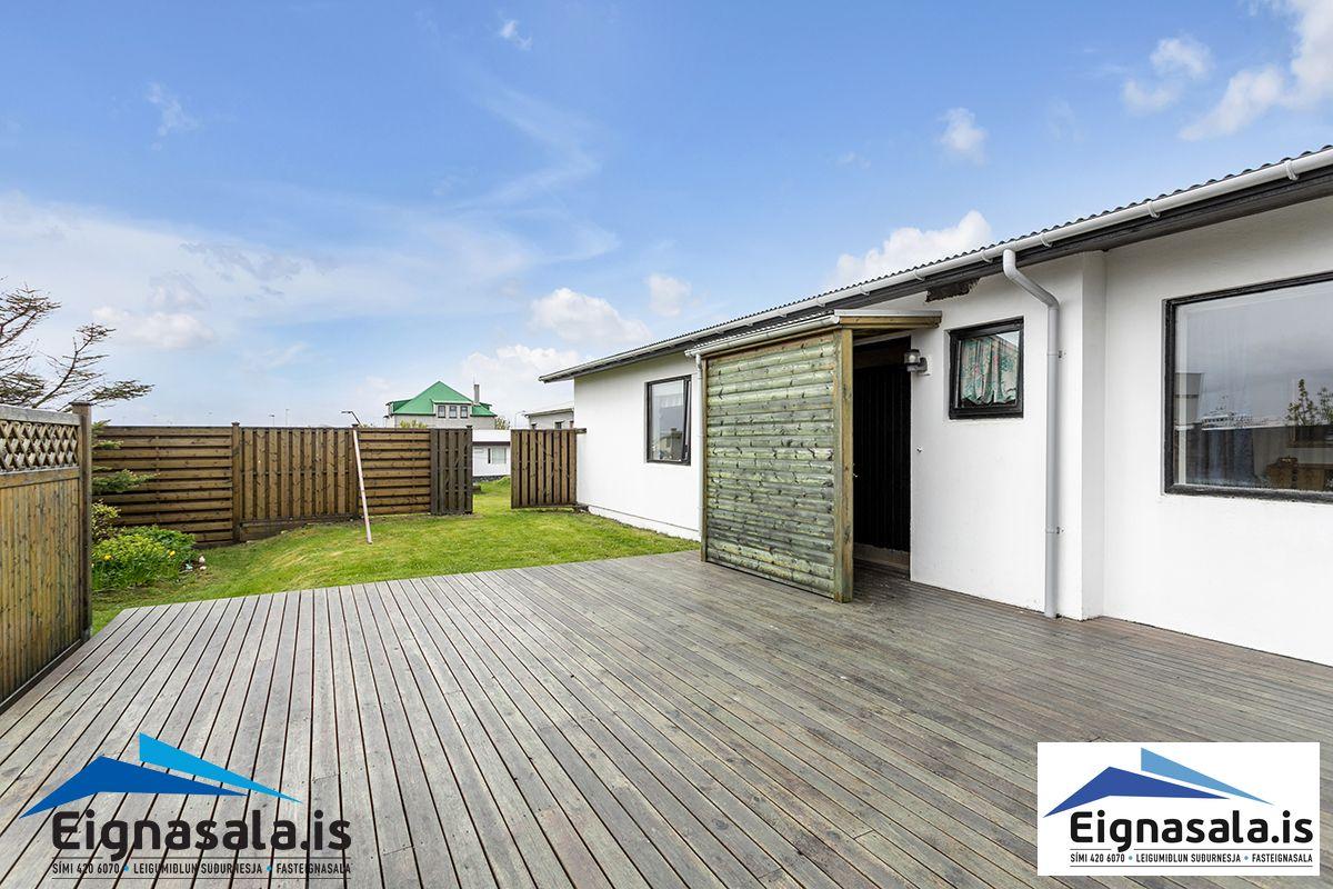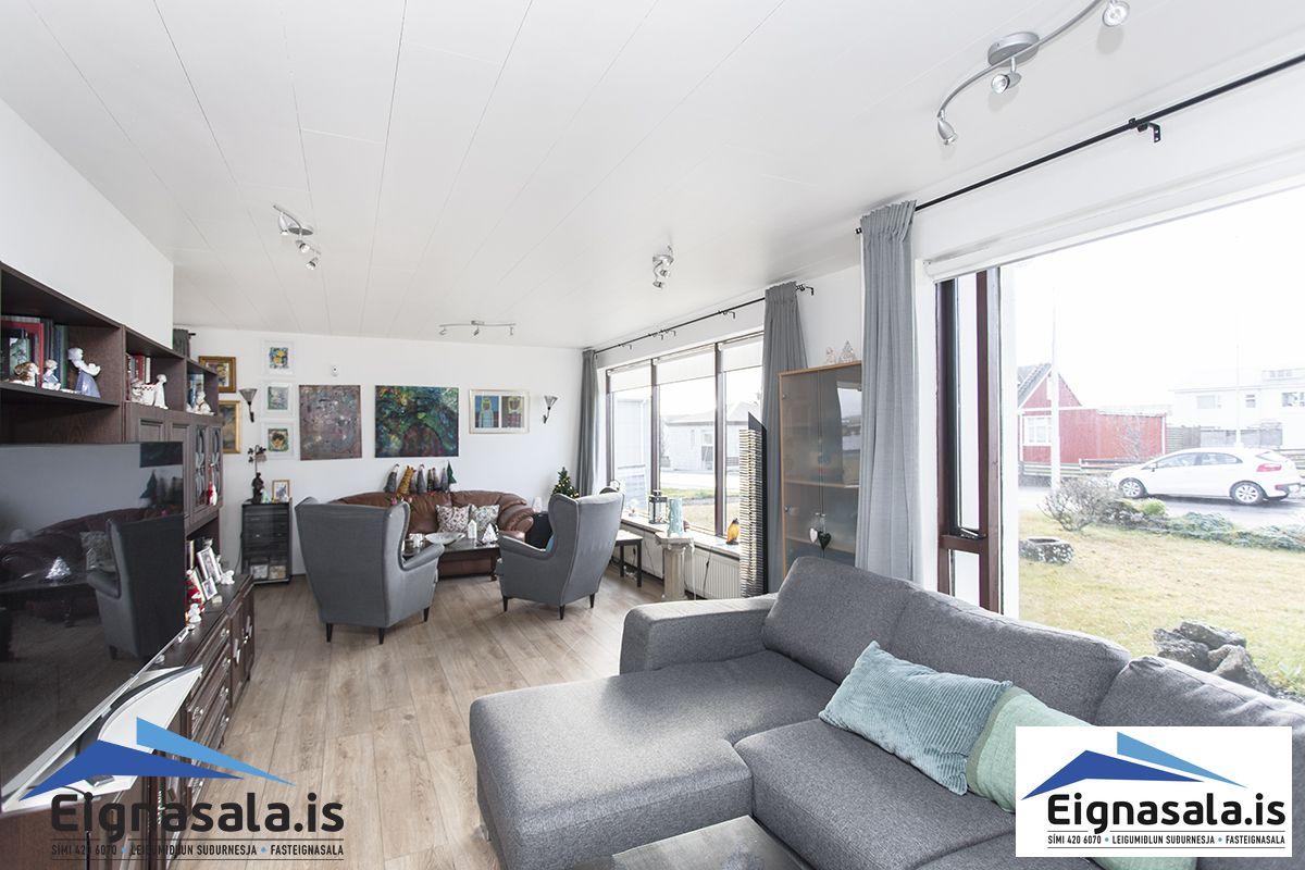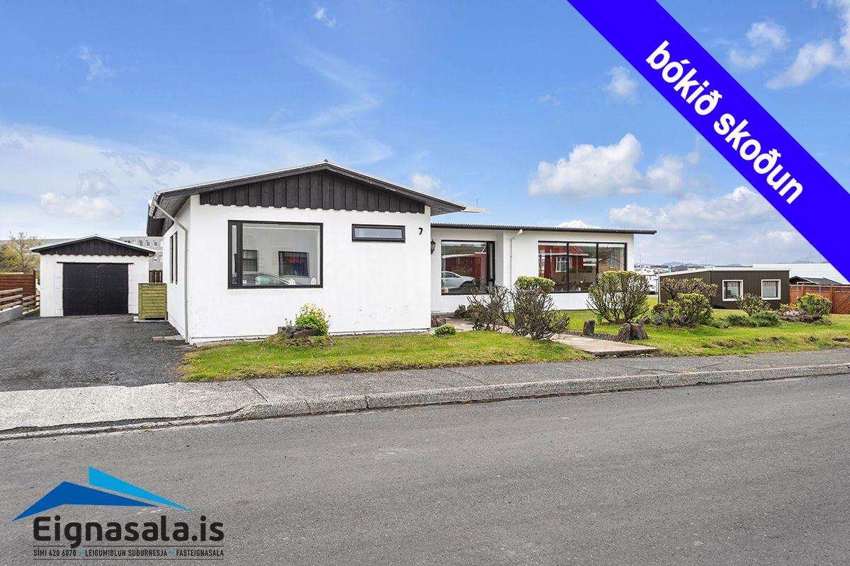 Nánari lýsing eignar: Anddyri með flísum á gólfi. Gestasalerni innaf anddyri. Eldhús með eldri innréttingu og nýlegu harðparketi á gólfi. Þvottahús innaf eldhúsi með útgengi á sólpall á baklóð. Borðstofa með nýlegu harðparketi. Mjög björt stofa með nýlegu harðparketi. Herbergjagangur með 4 svefnherbergjum, þar af er tvö minni herbergi sem hægt er að sameina í eitt. Nýlegt harðparket á öllum rýmum. Baðherbergi á herbergjagangi. Flísar á gólfi og veggjum. Sturtuklefi. Á baklóð er stór lokaður sólapallur með heitum potti. Mjög nýlegt járn á þaki, ný inngögnuhurð. Bílskúr er óeigangraður. Allir innveggir eru léttir, sami eigandi frá 1978 sem hefur haldið eigninni vel við.